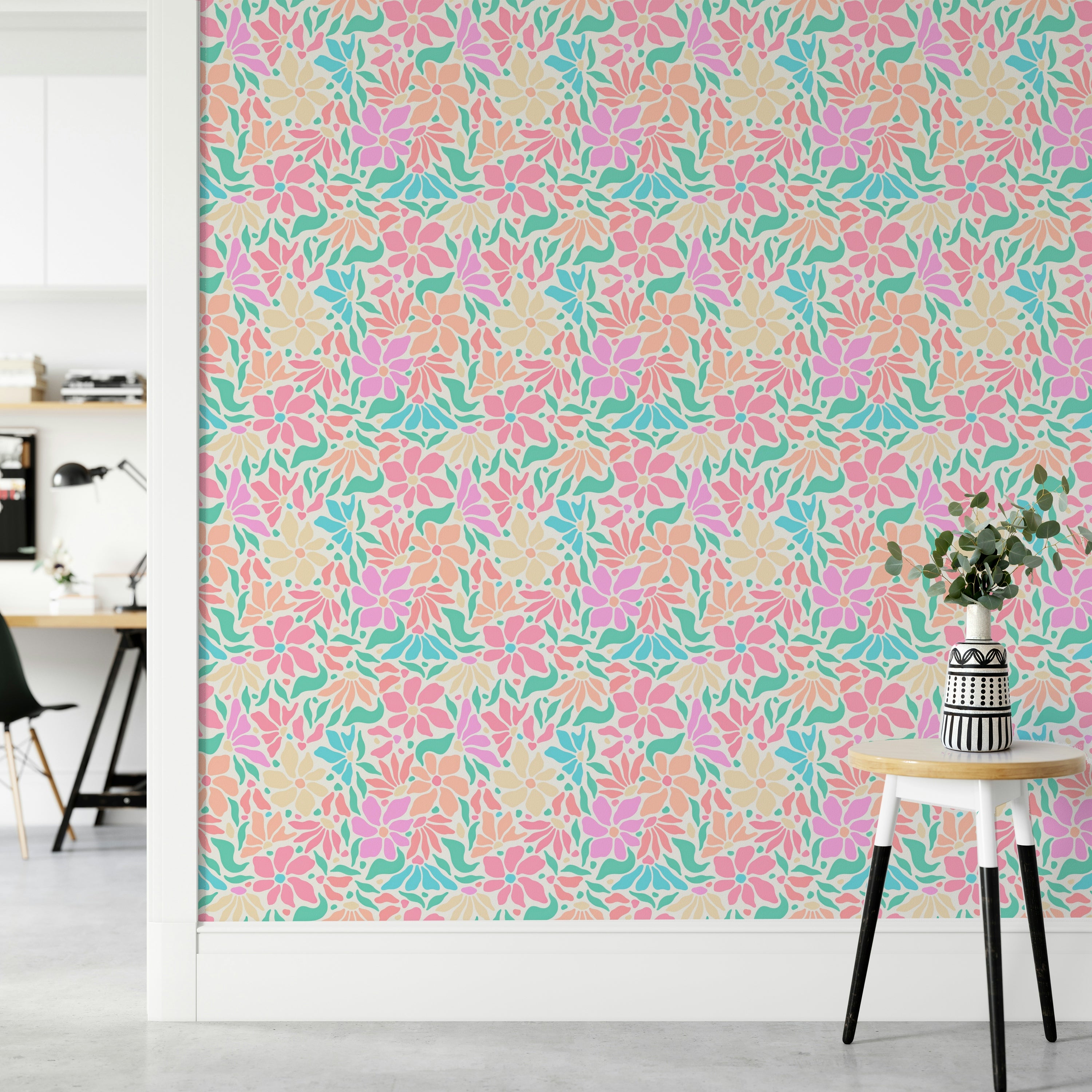 Dive into a vibrant world of 'Groovy Flowers,' a wallpaper design bursting with organic, free-flowing forms. Pastel pink, coral, mint green, and soft blue flower shapes dance across a creamy off-white background, creating a playful and uplifting mood. The stylized blossoms are reminiscent of 70s aesthetics, reflecting a retro-chic vibe. This seamless pattern offers a calming yet energetic backdrop, perfect for adding a touch of whimsical charm to any room.