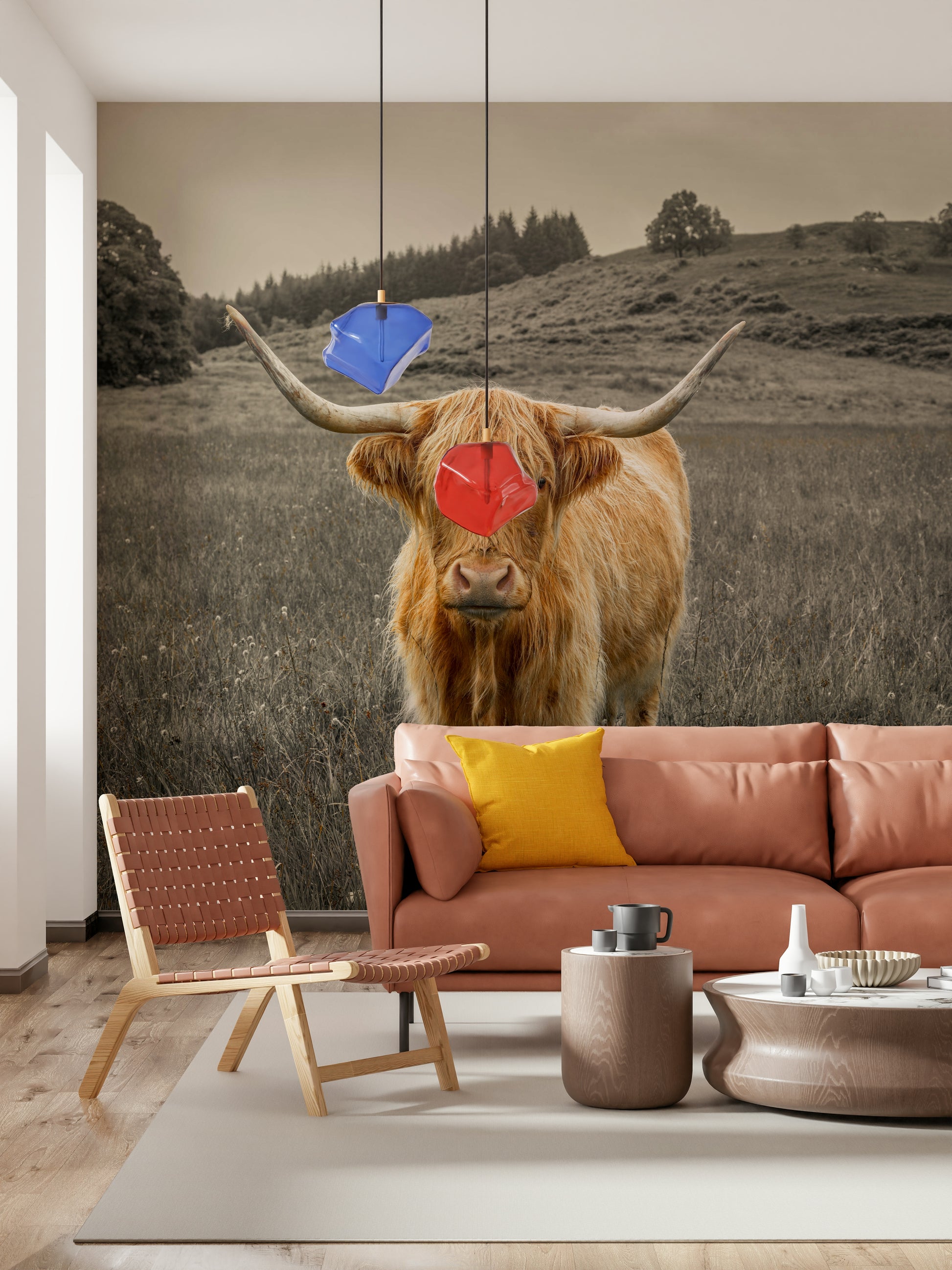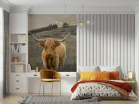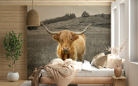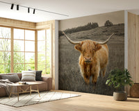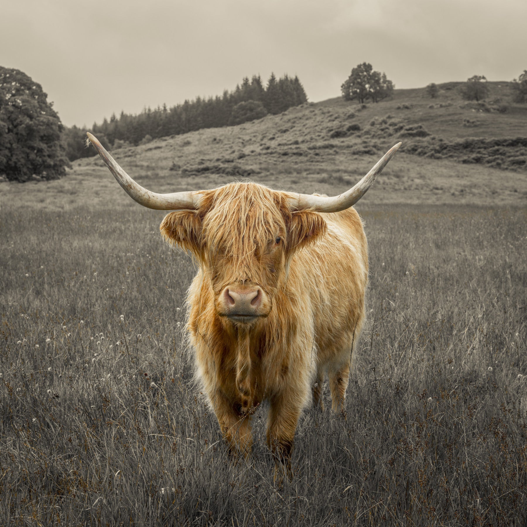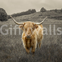 Highland Cow. Evoke the serene majesty of the Scottish Highlands with this captivating wall art. 'Guardians of the Highlands' presents a striking portrait of a Highland cow, a noble sentinel standing watch over its ancestral lands. The tonal palette of muted browns and greys creates a timeless, almost sepia-toned feel, accentuating the rugged beauty of the landscape. The cow's warm-toned fur provides a gentle contrast, drawing the eye to its commanding presence and the impressive span of its horns. A backdrop of rolling hills and distant trees adds depth, conjuring a sense of tranquil solitude and untamed wilderness. This piece brings the enduring spirit and quiet strength of the Highlands into your home, a statement piece that embodies both resilience and beauty.