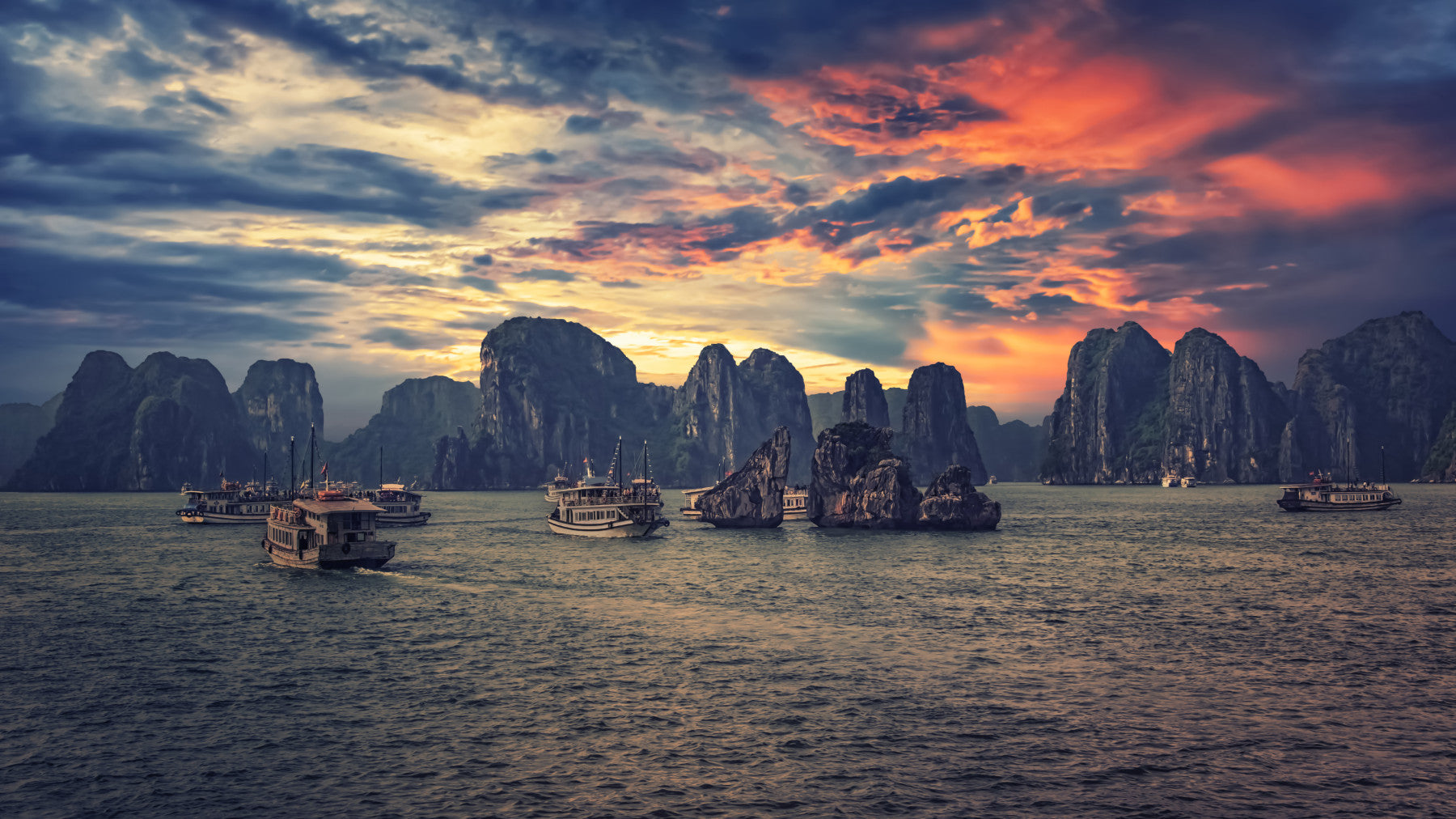 A beautiful Halong Bay wallpaper mural with a sunset sky.