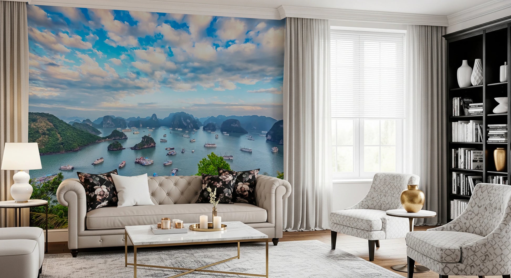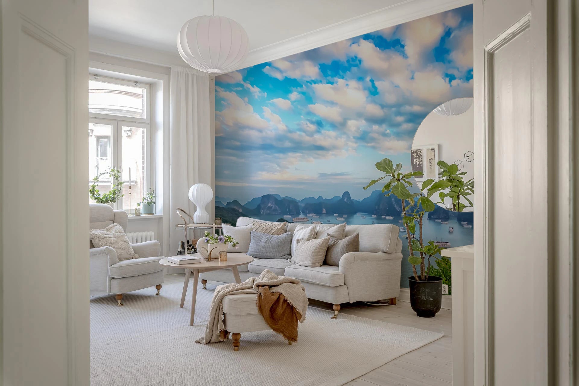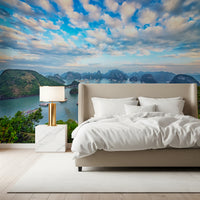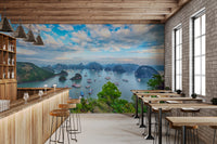 Transform your walls with the serene beauty of Halong Bay. This scenic wallpaper for walls showcases the breathtaking vista of emerald islands dotting the tranquil sea, capped by a sky awash in gentle blue and white clouds. The panoramic view brings a calming presence to any space, making it perfect for living rooms, bedrooms, or even a home office. The blend of blues and greens creates a soothing atmosphere, while the detailed landscape adds depth and visual interest. Elevate your interior with this stunning natural scene.