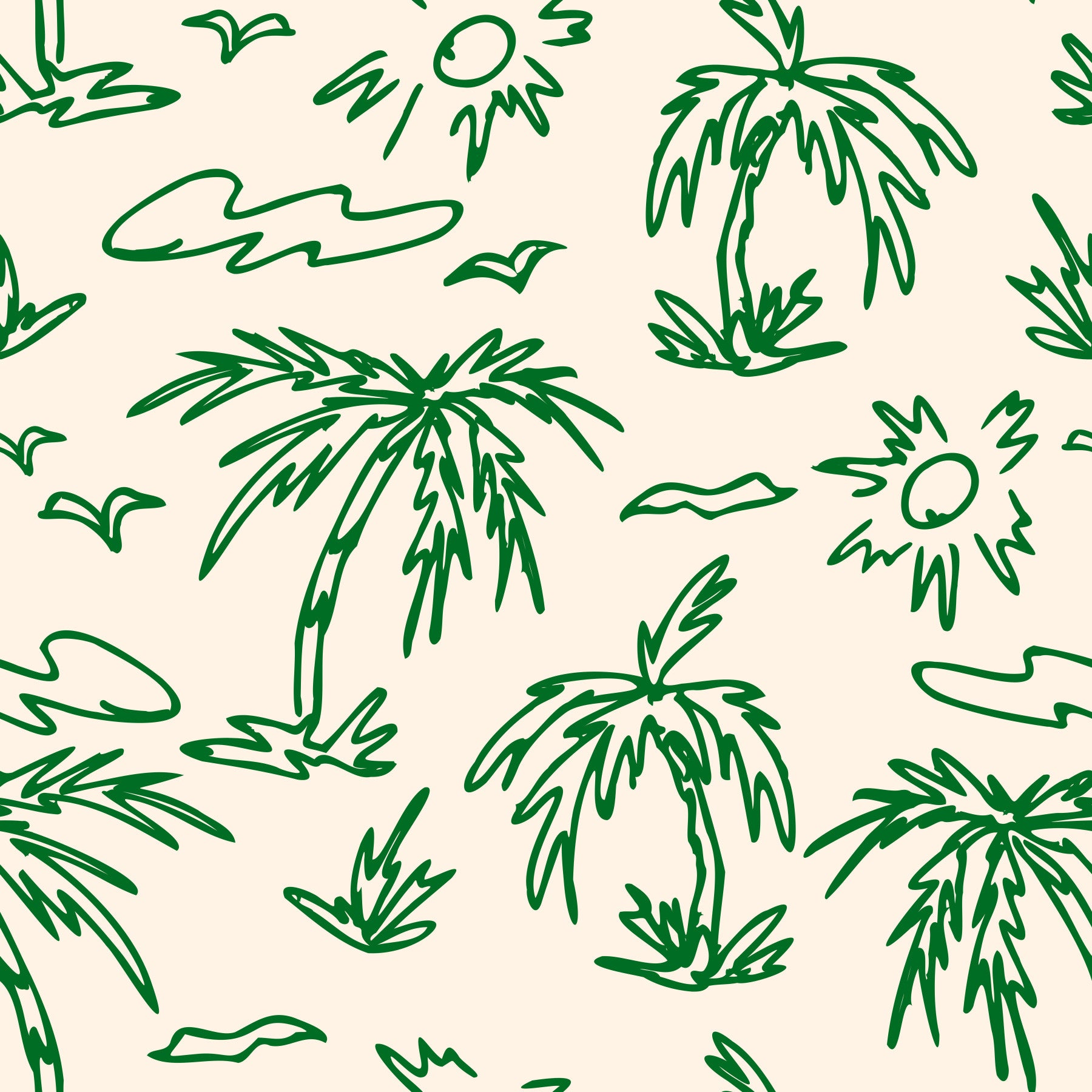 Invite a simple, breezy feel into your space with this sketched palm tree wallpaper. Green outlines create a playful pattern featuring palm trees, clouds, birds, and suns against a soft beige backdrop. This wallpaper for walls adds a touch of carefree tropical style to any room. It suits kids' rooms, nurseries, or even bathrooms, providing a light and cheerful background. The clean design blends well with minimalist or modern interiors, offering a calming yet stimulating visual.