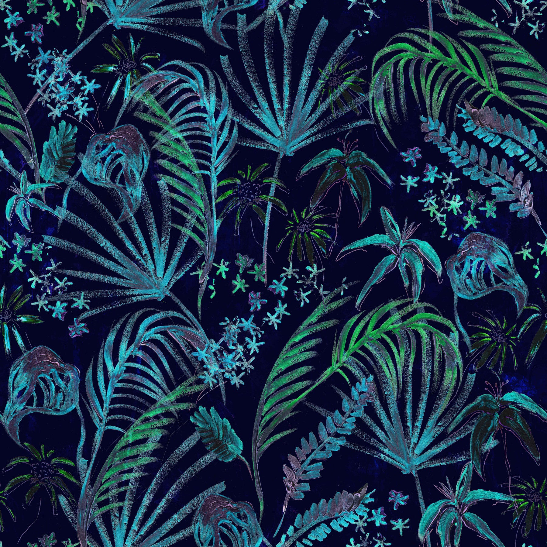 Transform your space with this exotic midnight jungle design. This wallpaper for walls features bold brushstrokes and a striking color palette. The dark background highlights the teal and green flora. Lush palms and abstract flowers come to life. Ideal for a living room or bedroom, this design adds a chic and exciting backdrop. It creates an atmosphere of contemporary elegance. Let the striking foliage define your interiors.