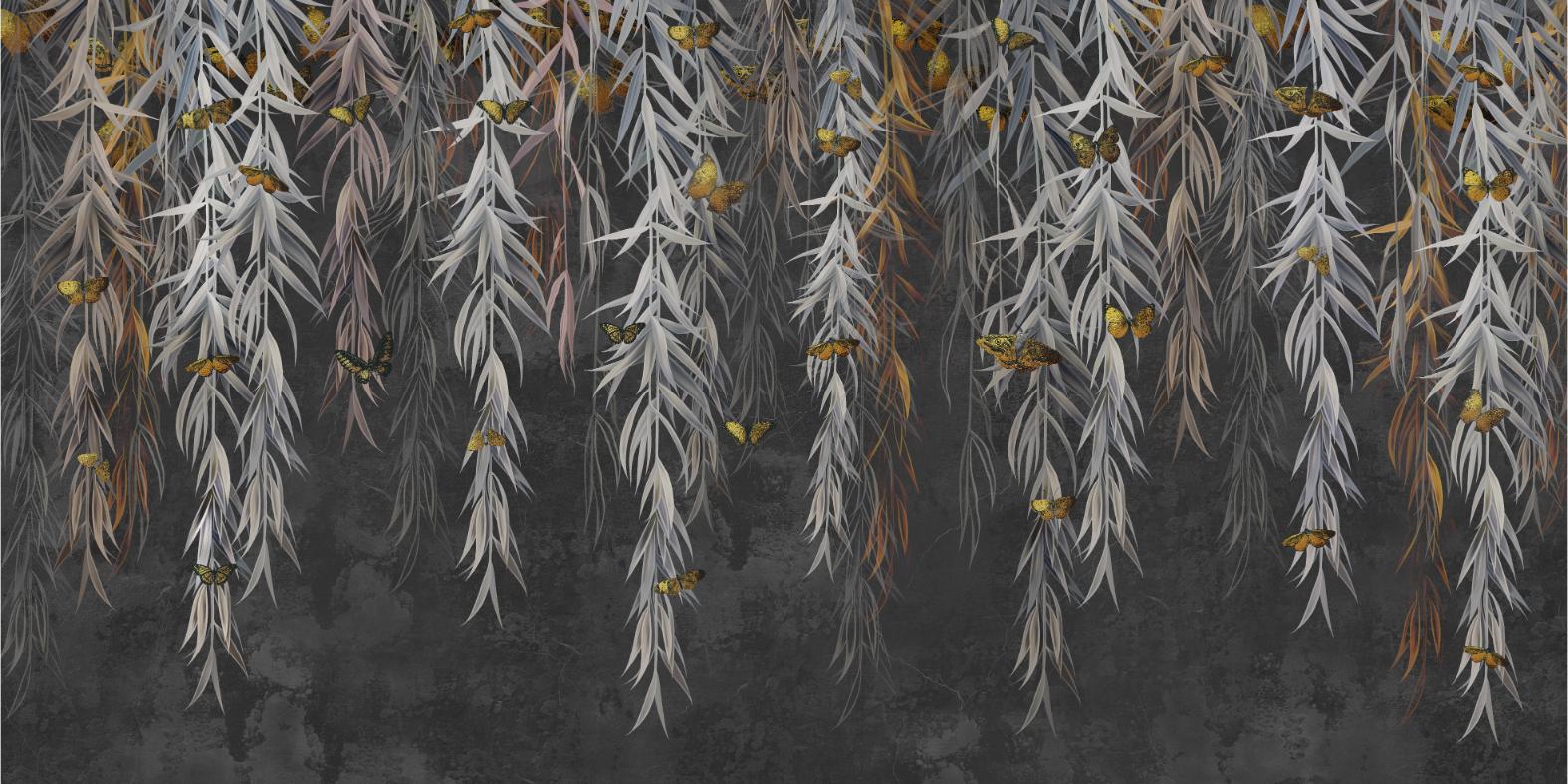 Serene hanging willow leaves and butterflies mural design