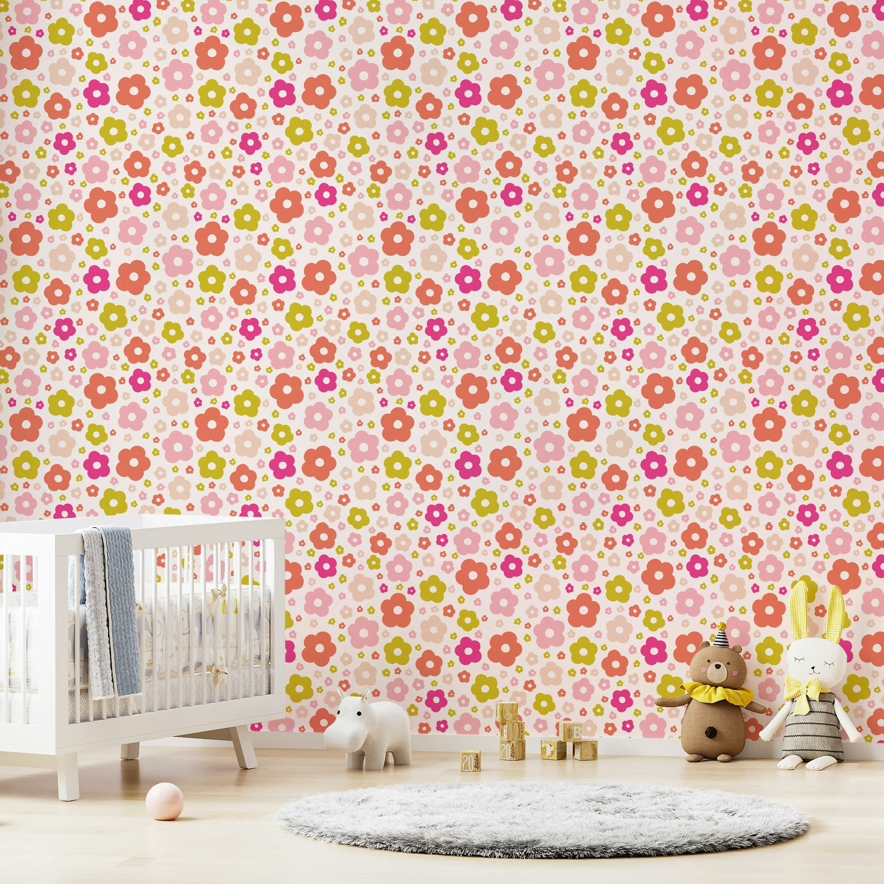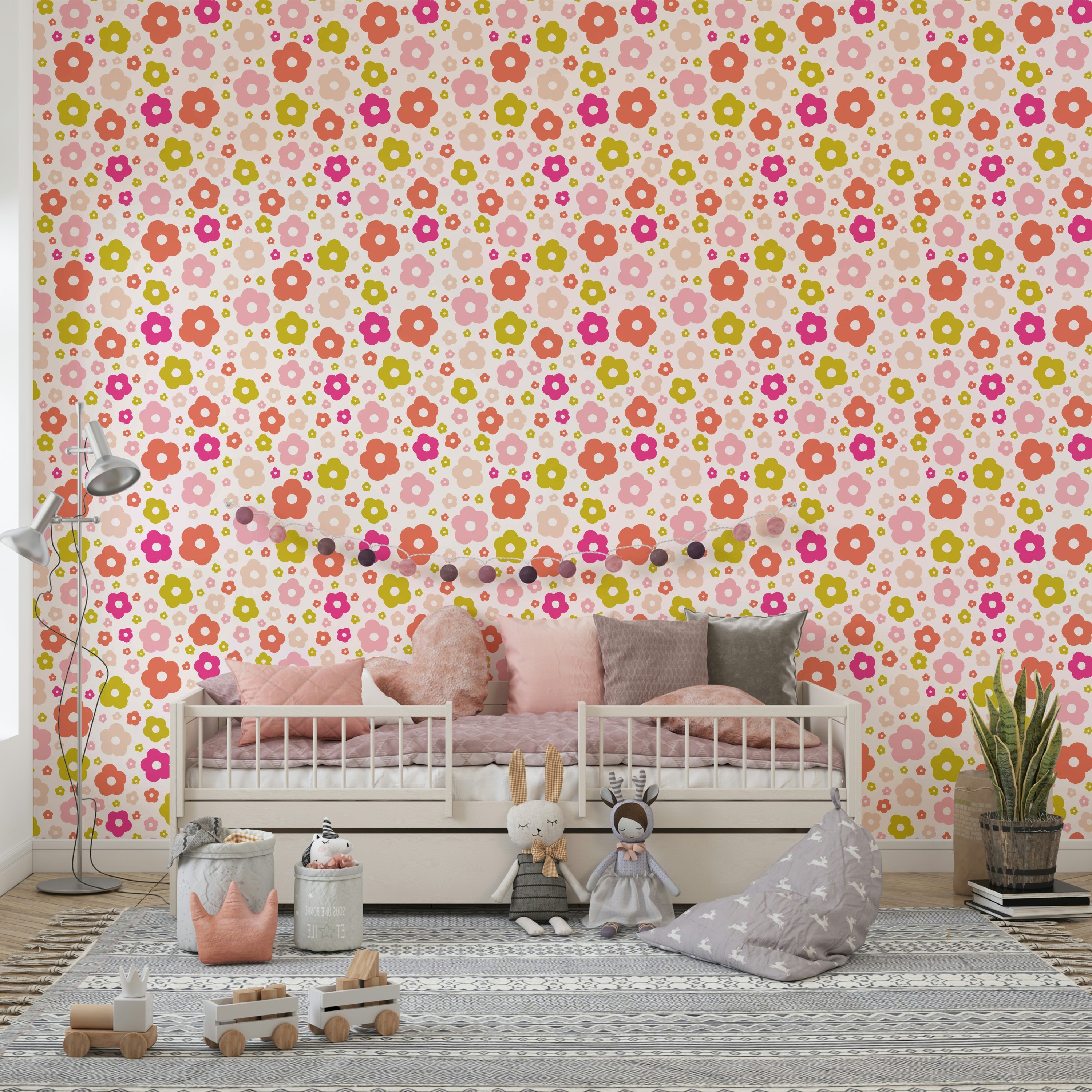 Bring a touch of sunshine and happiness to your space with this delightful wallpaper. The design showcases a scattered arrangement of charming daisies in a variety of warm and inviting colors. Soft pinks, corals, and golds blend seamlessly with a bright white background, creating a light and airy atmosphere. This wallpaper's simple yet elegant design is both playful and sophisticated, making it ideal for bedrooms, nurseries, or any space that could benefit from a happy and uplifting mood. Its versatility makes it a perfect addition to modern or retro-inspired interiors.