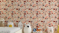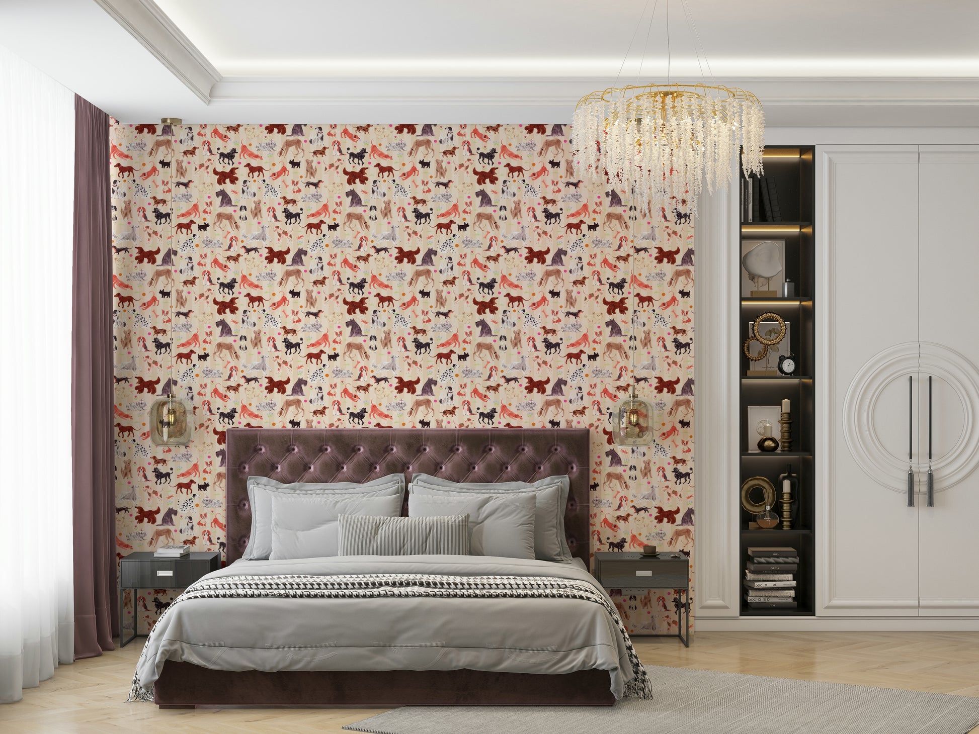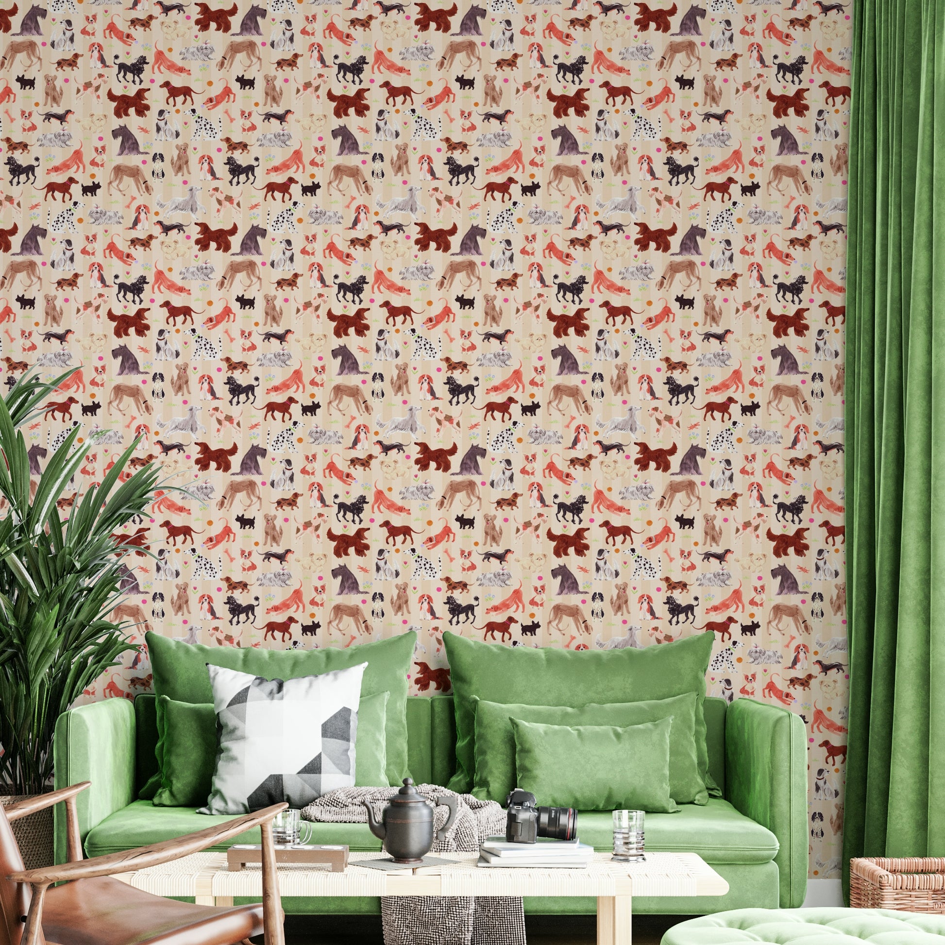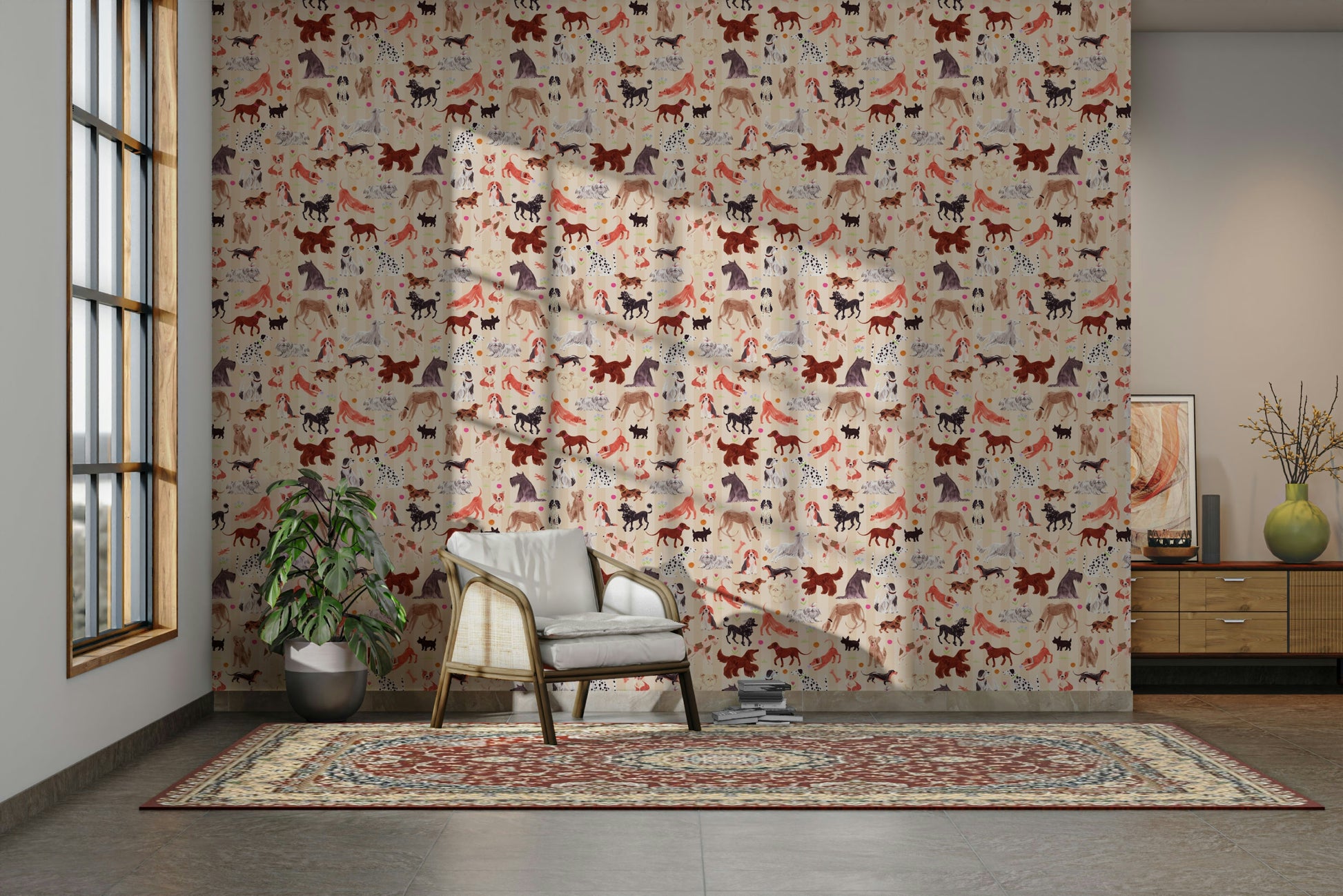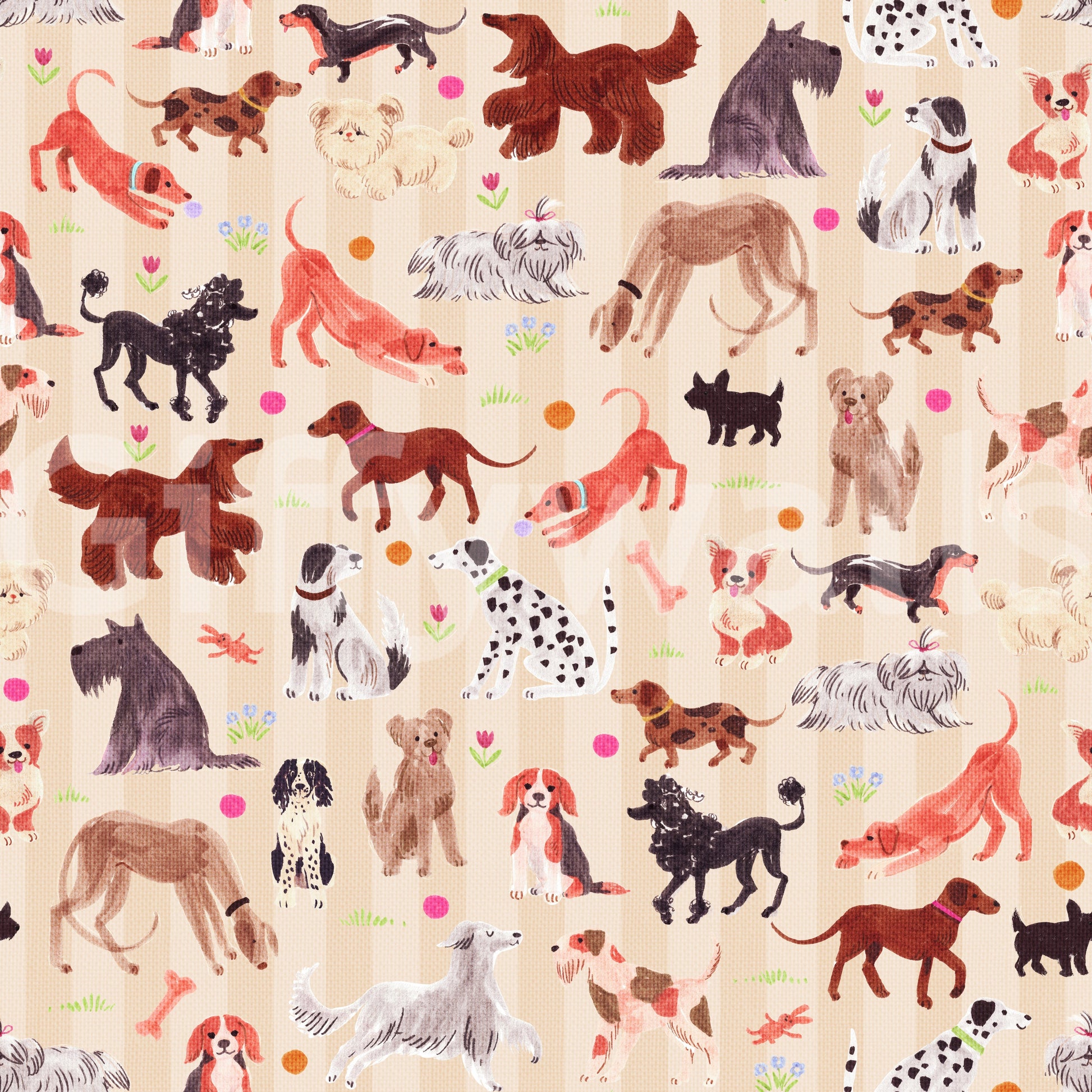 A delightful wallpaper featuring a charming collection of hand-drawn dogs. Each pup, rendered in a whimsical watercolor style against a soft beige and striped background, exudes happiness and playful energy. From playful Dachshunds to elegant Afghan Hounds, a diverse array of breeds frolic amidst scattered flowers and playful bones, creating a cheerful and vibrant scene perfect for dog lovers.