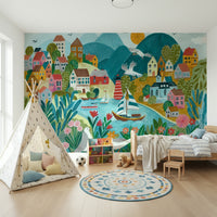 Imagine a colourful harbour town bursting with life! This artwork brings joy to any space. See the charming buildings, seagulls soaring, and boats gliding on the water. The vibrant palette delivers a whimsical vibe perfect for a nursery, kids’ playroom, or living room. This engaging wallpaper for walls transforms interiors. The design style blends folk art elements with a bright, naive touch. Soft colours make it a versatile addition that complements many room designs.