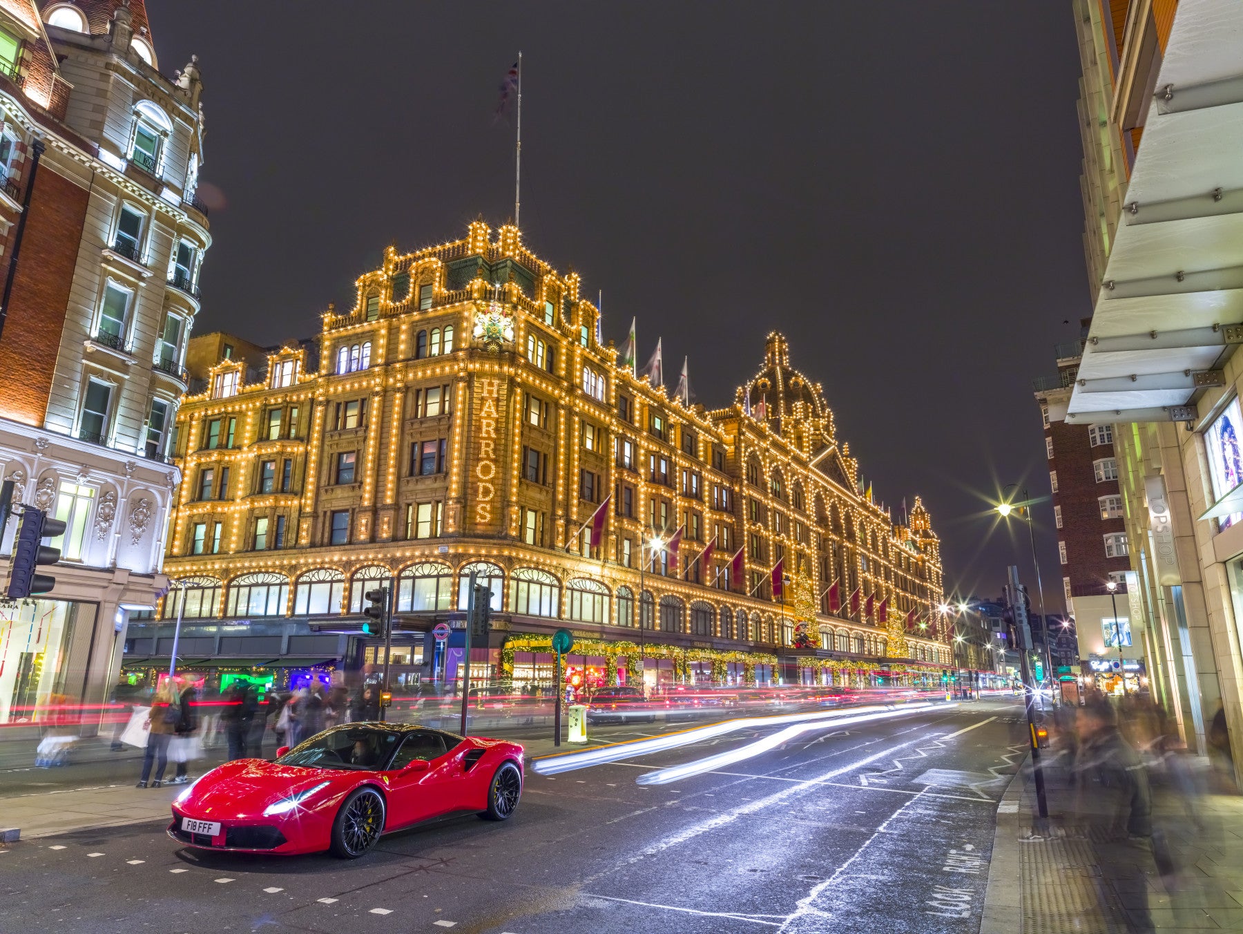 Adorn your home with the iconic elegance of our Harrods, London Wall Mural. This striking mural wallpaper captures the grandeur of Harrods department store illuminated at night, featuring its distinctive golden lights and the vibrant energy of London's streets. A sleek red sports car and light trails from passing vehicles add a touch of modern luxury and dynamism to the scene. It’s an ideal wallpaper for walls to introduce unique character and sophisticated allure to any room. Its rich illumination and detailed architecture offer a captivating backdrop, ensuring your home feels both vibrant and beautifully connected to the excitement of Knightsbridge.