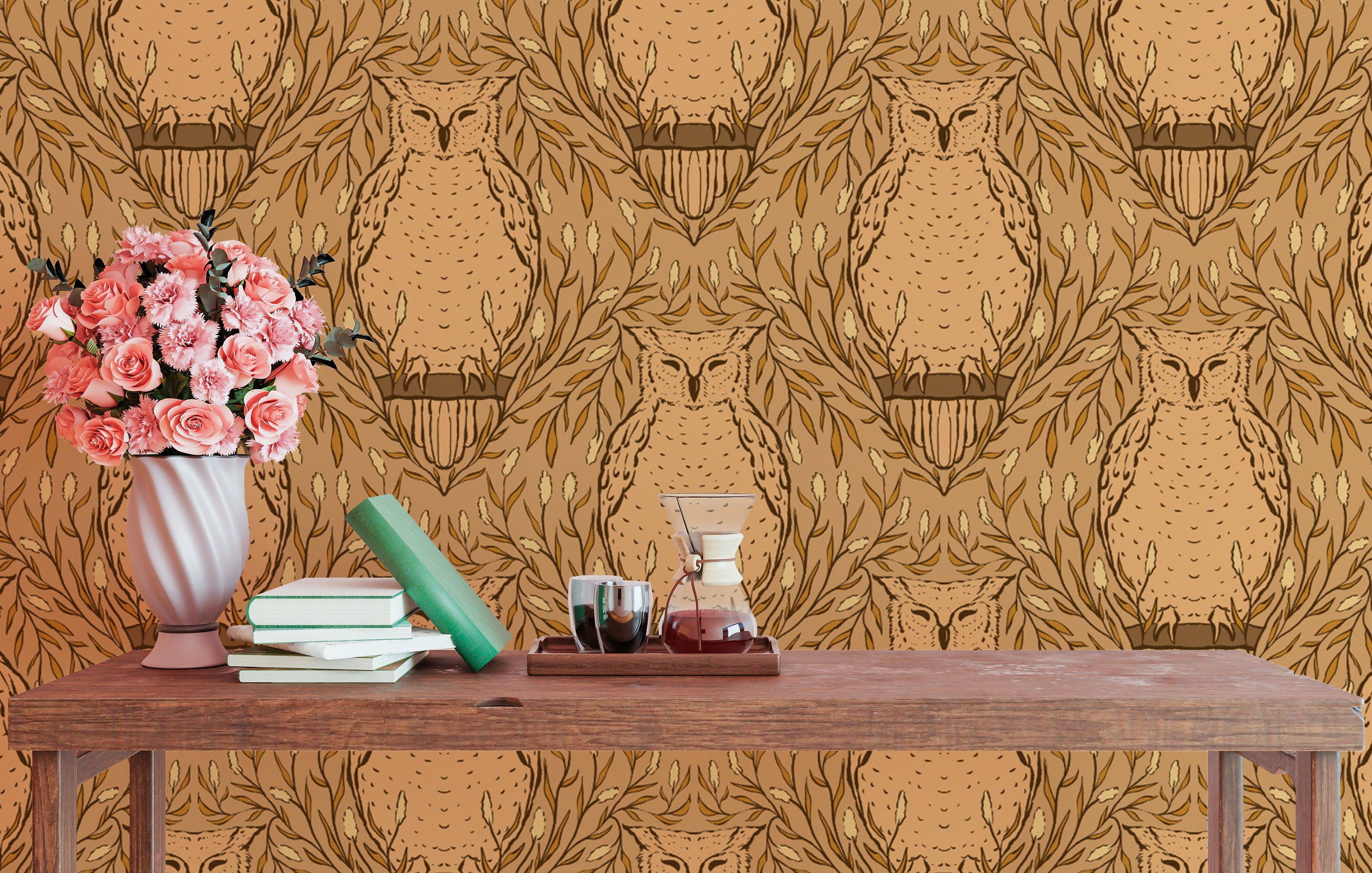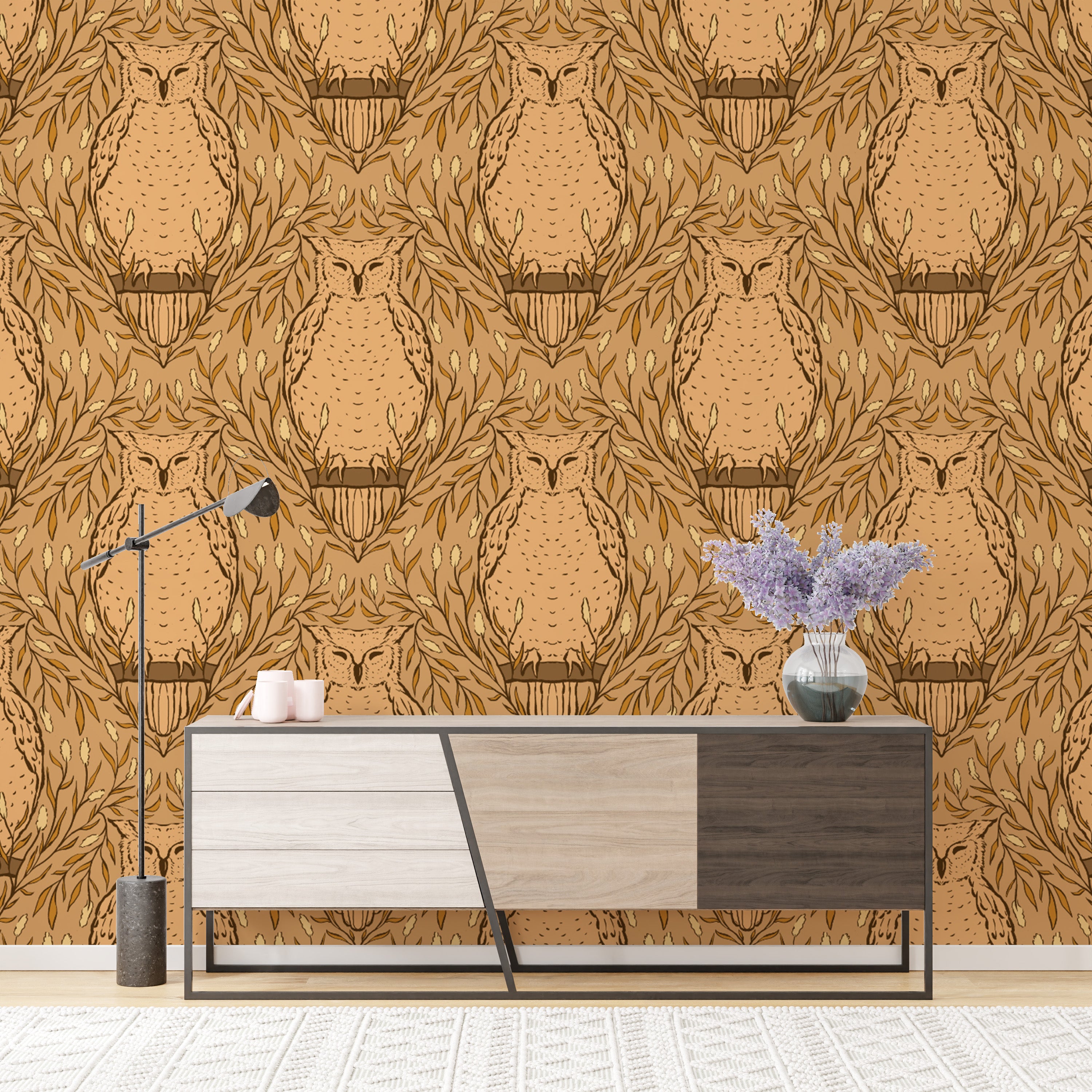 Artistic harvest owl wallpaper for unique and bold wall design.