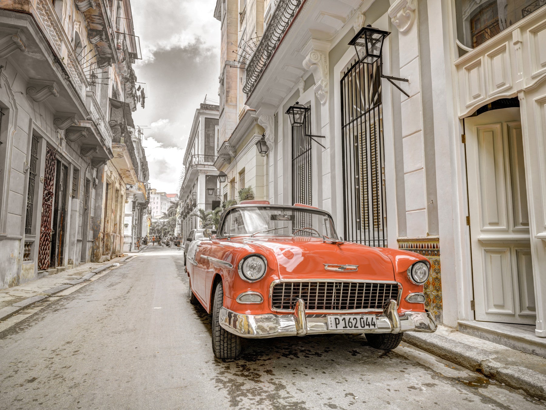 Vintage car on street of Havana, Cuba, Cruise down memory lane with this retro Havana scene. The bright coral vintage car pops against the aged buildings, creating a striking contrast. The aged aesthetic brings warmth and character to any room. Use this wallpaper for walls to capture a sense of adventure. It works well in a living room, hallway, or home office, bringing a vibrant vintage charm to your interiors.