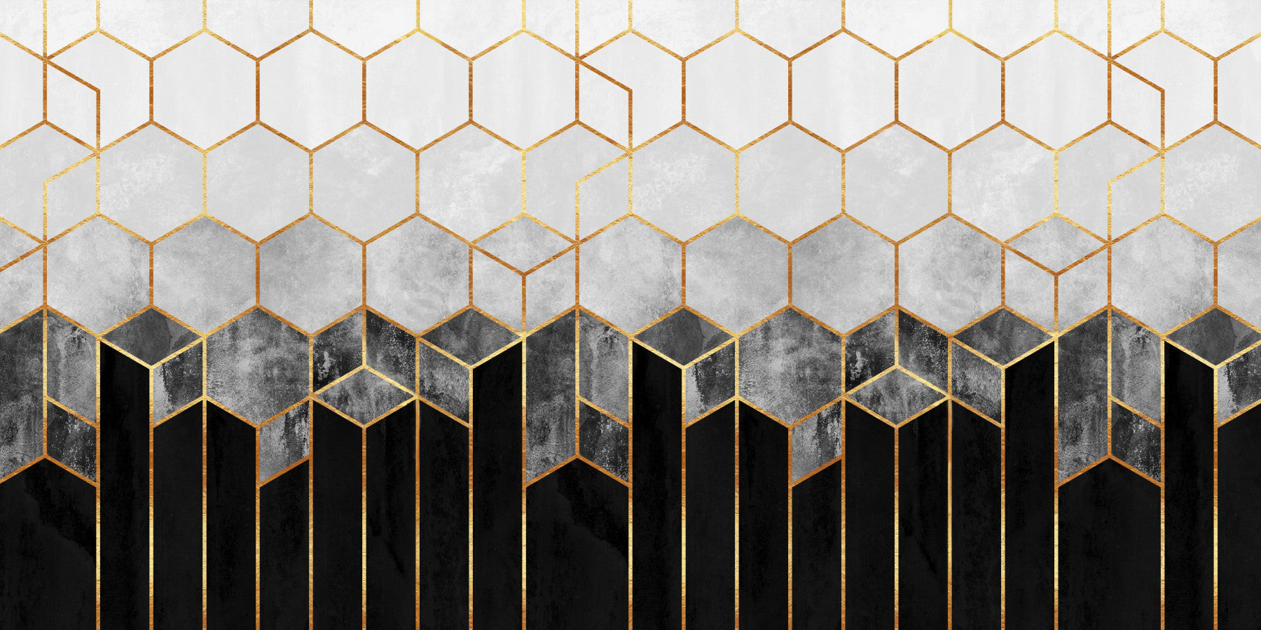 Transform any room with this captivating geometric wallpaper for walls. The design features a striking arrangement of hexagons with gold trim, transitioning from white and gray to deep black, creating a dramatic ombre effect. This design offers a sleek, artistic touch, ideal for spaces that need a dash of elegance. It works well in modern living rooms, sophisticated bedrooms, or even stylish hallways, blending effortlessly with various décor schemes.