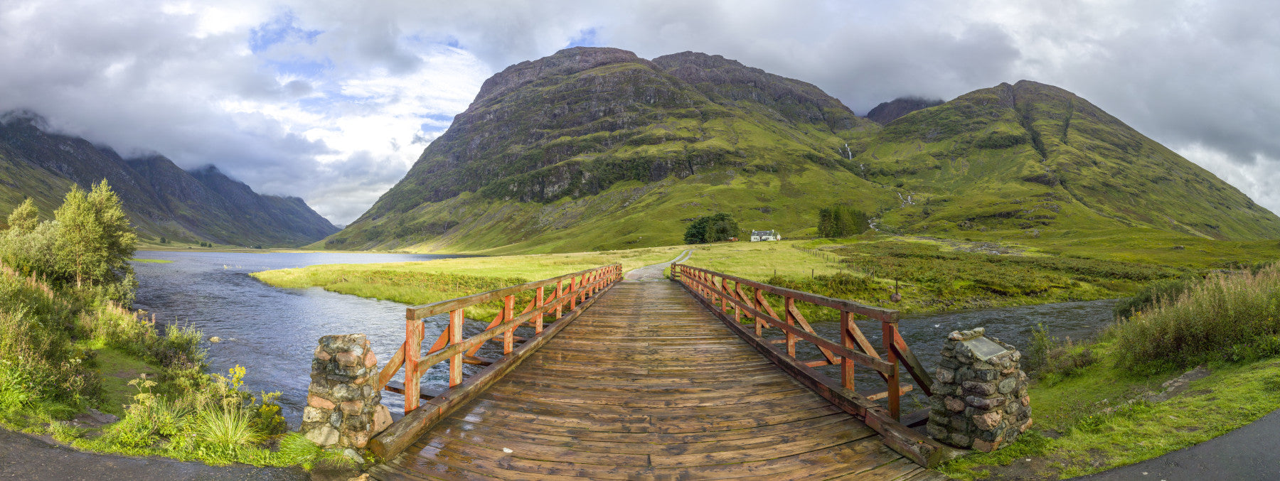 This breathtaking wallpaper captures the serene beauty of a rustic wooden bridge spanning a tranquil river, nestled amidst a stunning Scottish Highland landscape. Towering green mountains under a slightly cloudy sky create a dramatic backdrop, enhancing the peaceful atmosphere. The weathered wood of the bridge and the vibrant green hills evoke a sense of timeless tranquility and natural wonder. Perfect for those seeking a calming and inspiring escape to the beauty of nature.