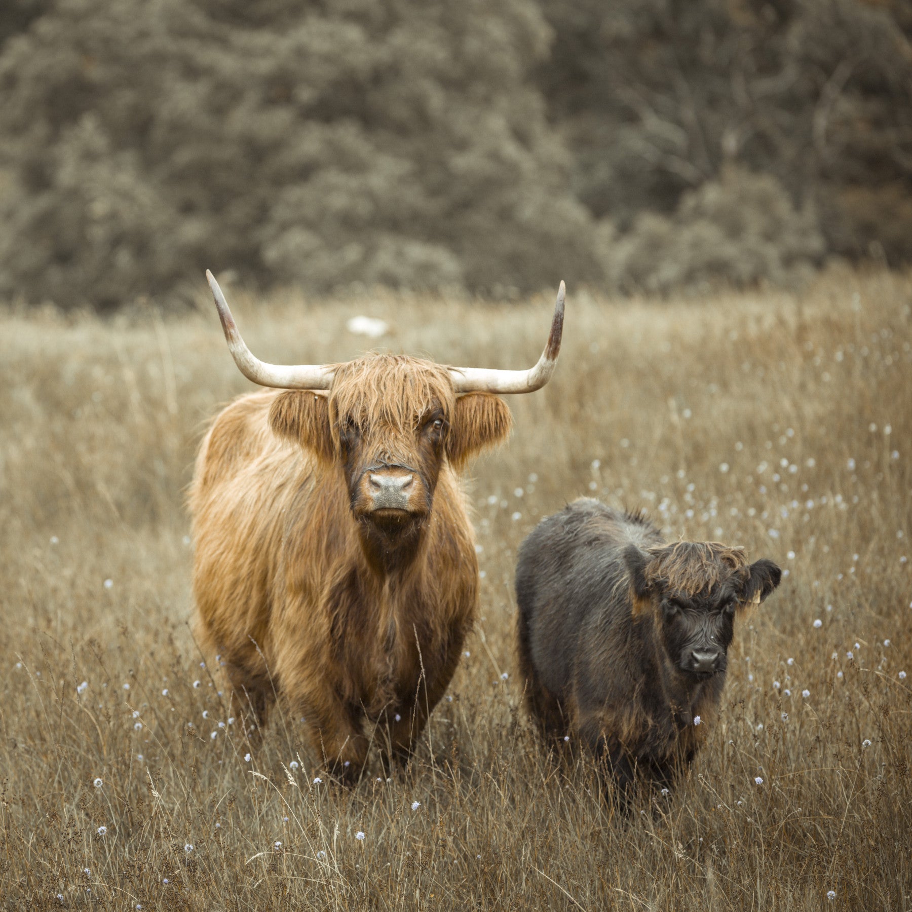 This wallpaper captures the tranquil beauty of a Highland cow and her calf, standing serenely in a field of golden-brown grasses. The soft, muted tones create a peaceful atmosphere, evoking feelings of calm and tranquility. The image's focus is on the majestic animals, their shaggy coats contrasting beautifully against the muted backdrop. This wallpaper is perfect for those seeking a calming, nature-inspired design for their space, adding a touch of rustic charm and quiet elegance.