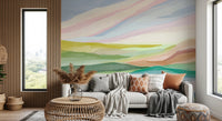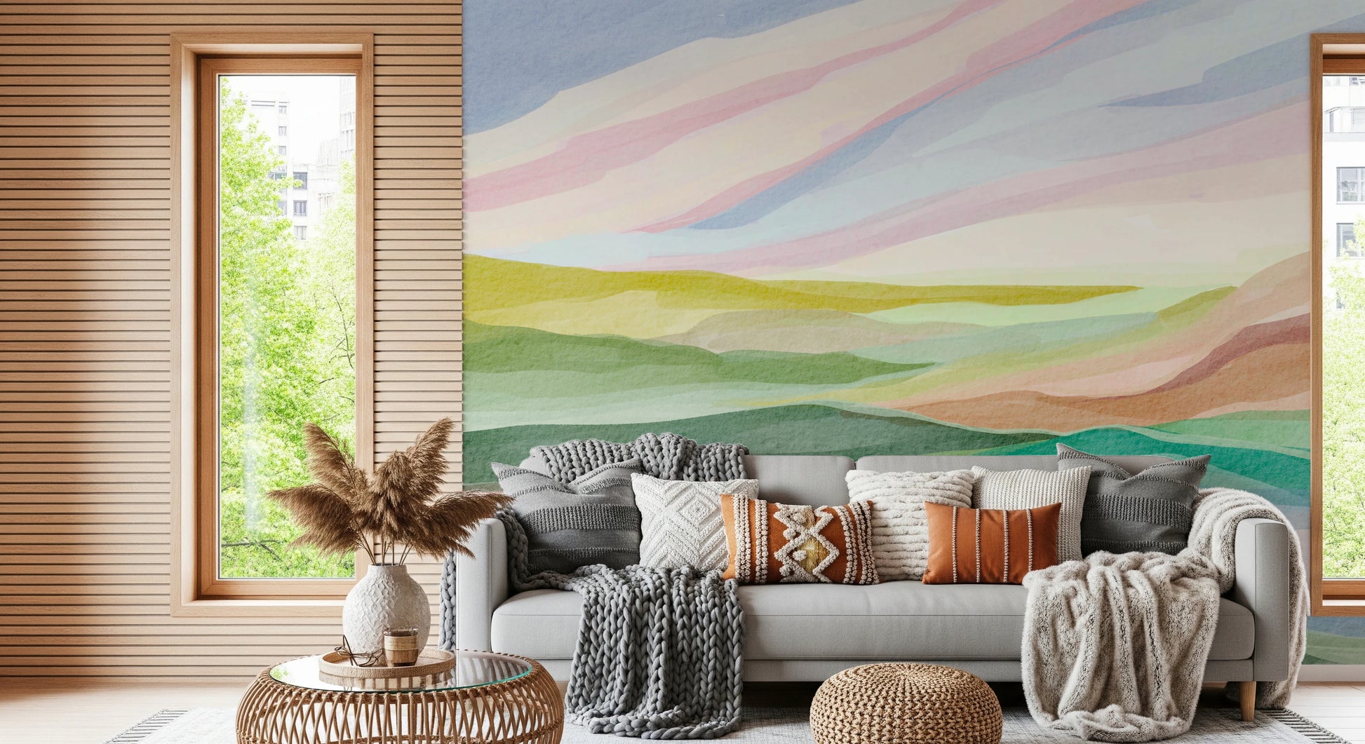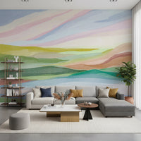 Elevate your interior spaces with this unique wallpaper for walls featuring a watercolour landscape. The design incorporates soft hues of green, brown, blue, and pink, creating a seamless blend of colour that evokes a sense of calm. Ideal for a bedroom, study, or living area, this wallpaper introduces a refined and tranquil atmosphere. The brushstroke texture adds depth and dimension, giving the illusion of hand-painted artwork. This elegant design brings understated sophistication, enhances the room’s natural light, and creates a relaxing environment for any interior space.