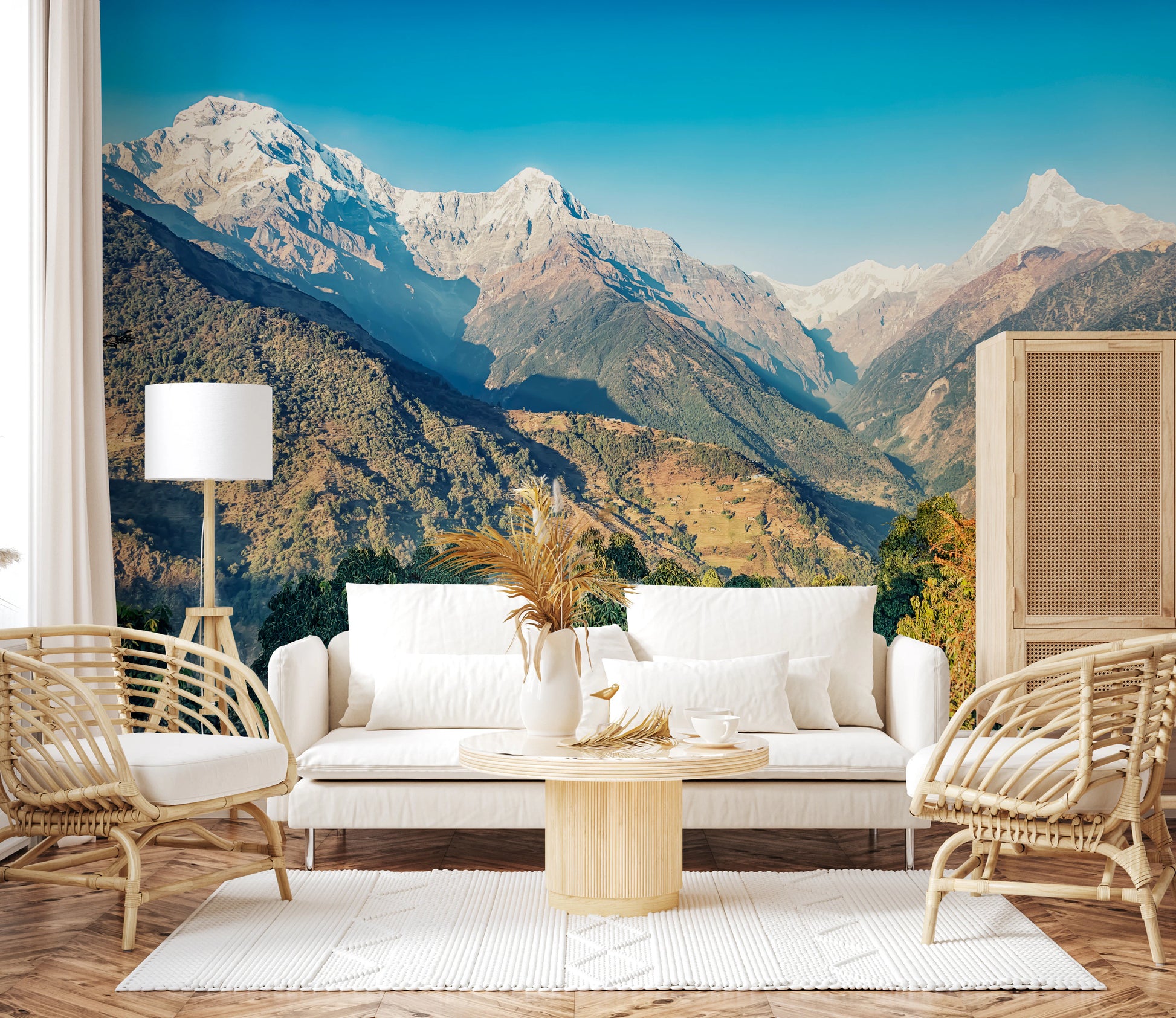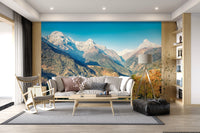 Elevate your interior with this striking mountain vista. The majestic snow-capped peaks and rolling green hills bring nature's grandeur into your living space. Soft light captures the textures of the mountainside, creating depth and dimension on your walls. The vibrant sky contrasts with the Earthy tones of the landscape, offering a visual harmony that calms and inspires. This wallpaper for walls fits perfectly in living rooms, bedrooms, or studies, infusing tranquility and a sense of adventure. Let your walls tell a story of peaceful mountain landscapes.