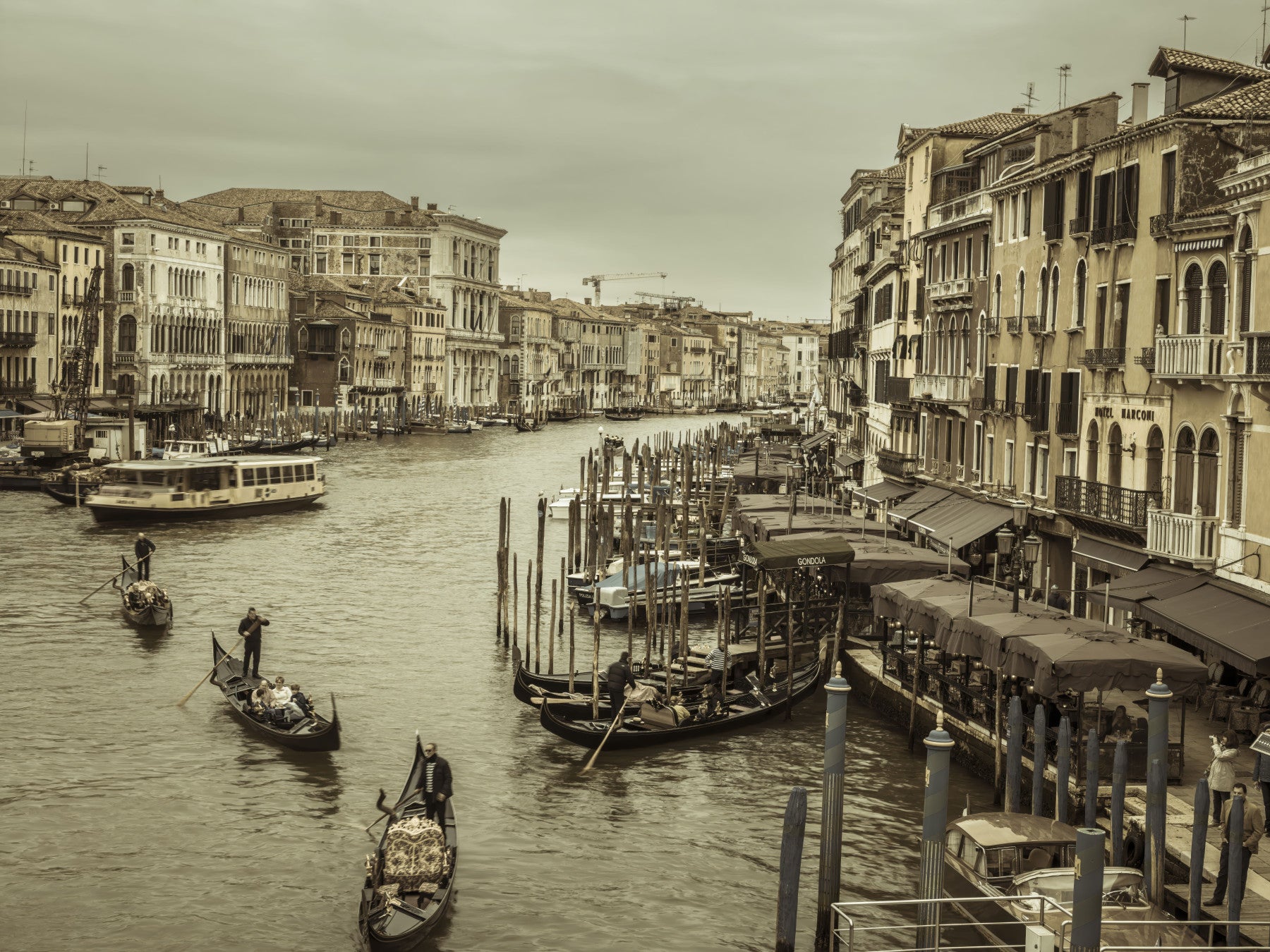Italian city Historic Grand Canal scene, evocative sepia-toned covering.