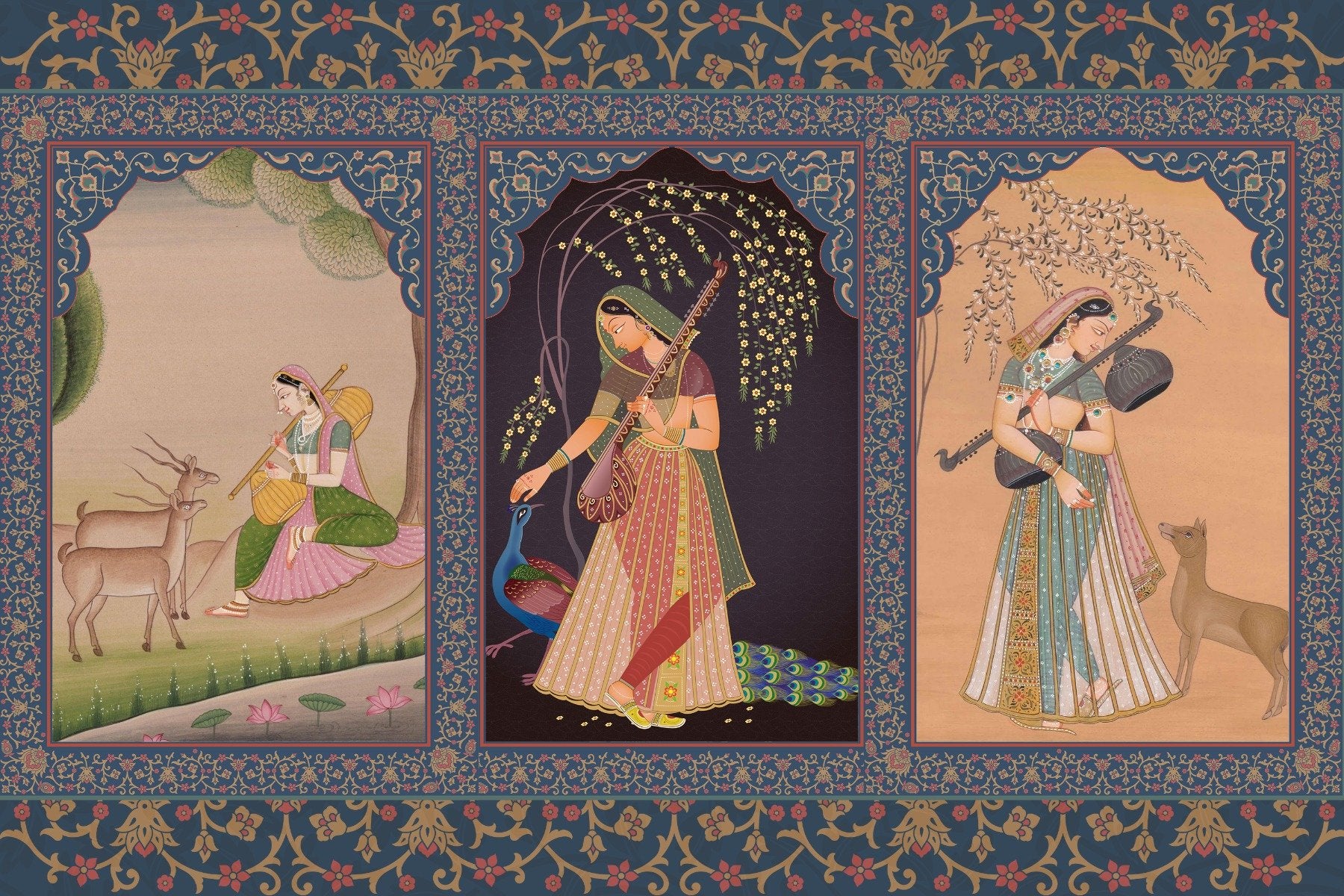 The historic Indian princess wall mural is a vibrant testament to the opulent history of India, immortalized in strokes of color and heritage. This vintage wallpaper brings the tales of regal splendor straight from the palatial courts of ancient dynasties to the modern home. Adorn your walls with the finesse of historic wallpaper, where each panel narrates the grace and dignity of Indian princesses dressed in their ornate attire, accompanied by the natural beauty of their royal gardens. Crafted for history and art lovers, the mural is an exquisite blend of tradition and artistry. It's a piece that celebrates the rich tapestry of India's past, inviting viewers to a visual feast of cultural magnificence. This royal Indian maharani wallpaper mural embraces a slice of history, where every look is a journey through time to the grandeur of India's majestic lineage.