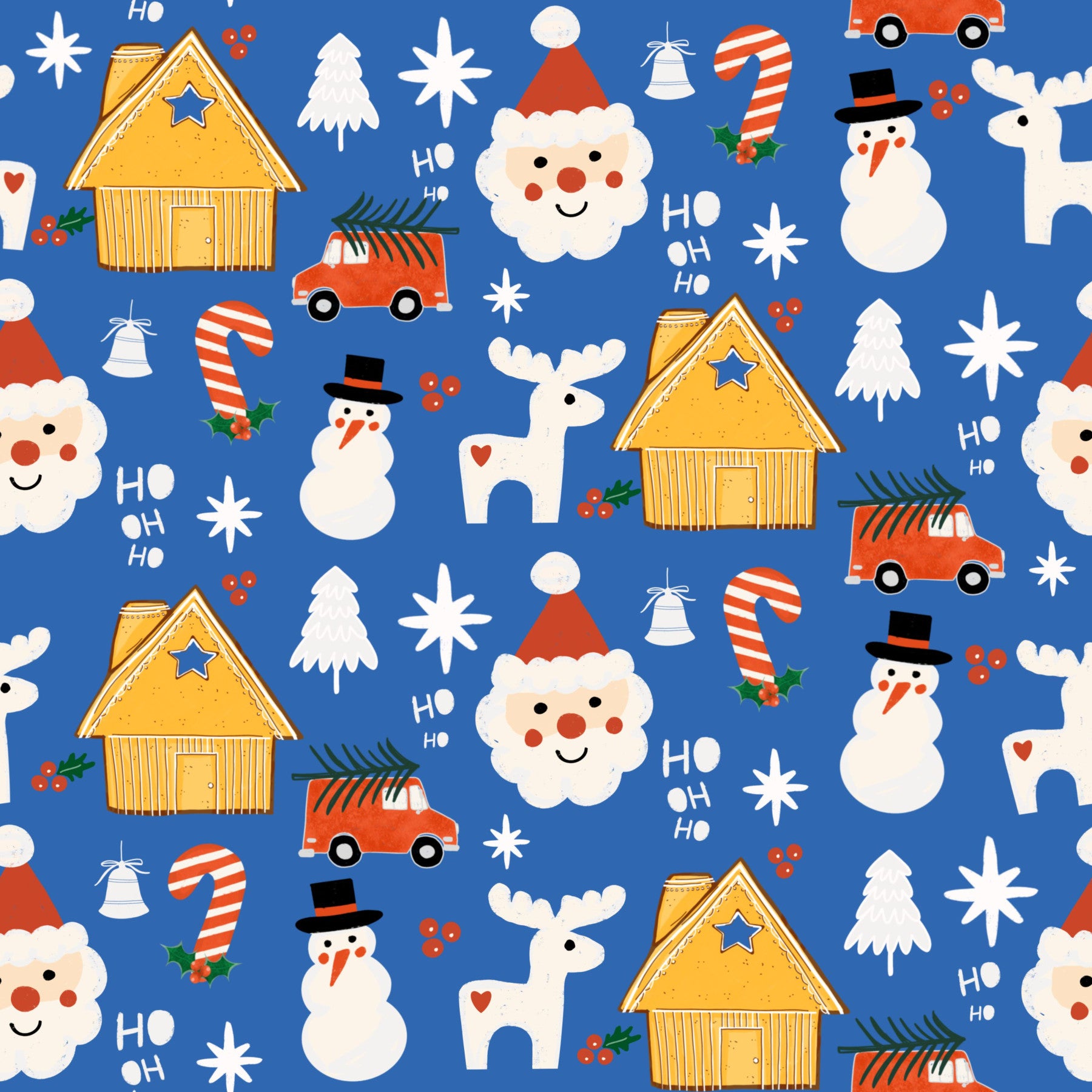 Playful Christmas icons scattered across a blue holiday wallpaper filled with Santa, trees, and candy canes.