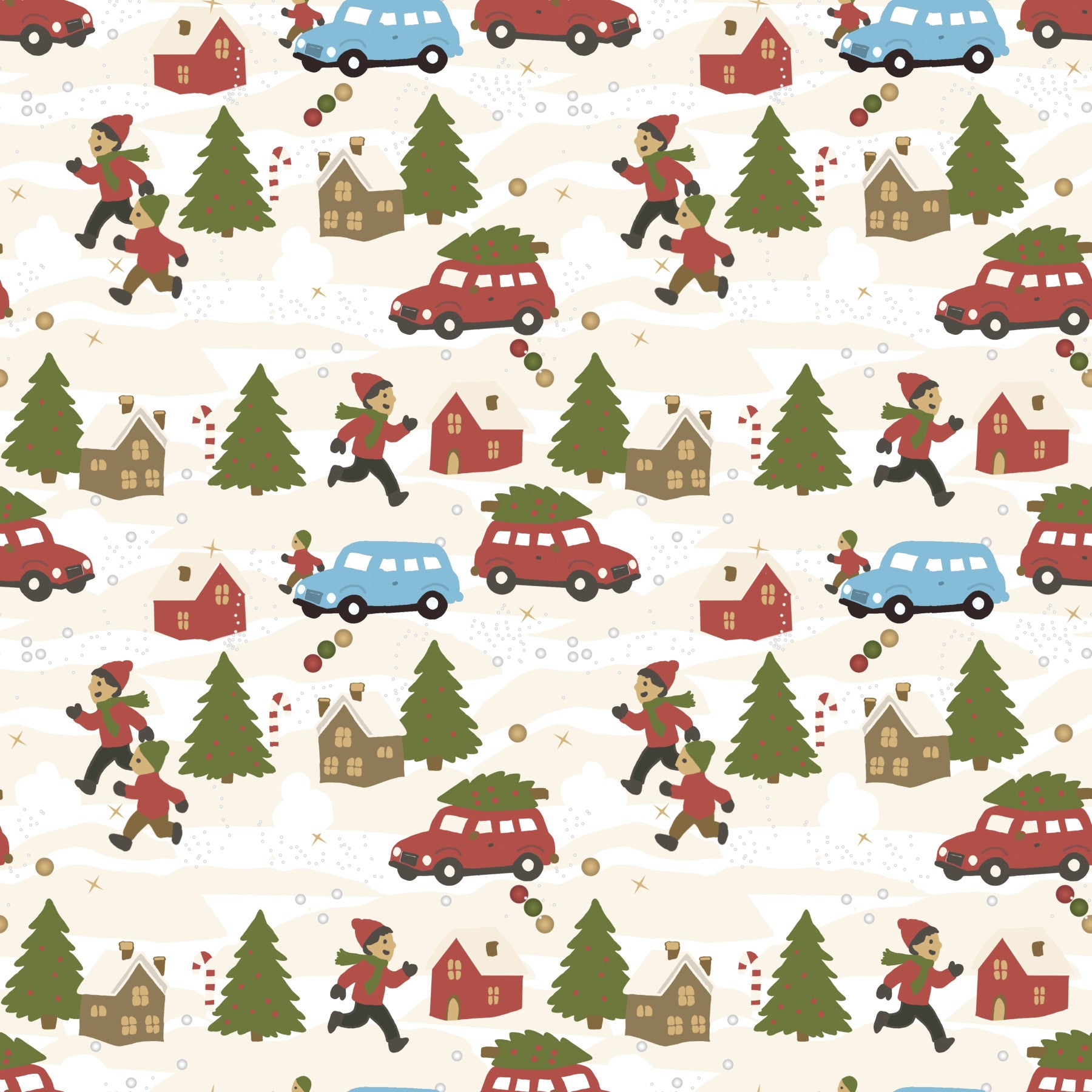 Bring the joy of the holiday season to your home with this delightful wallpaper. The charming design features kids running amidst snowy landscapes, adorned Christmas trees, and classic cars. Use this wallpaper for walls to create a festive ambiance in any room. The warm reds and blues against a beige backdrop are suitable for children's rooms, playrooms, or even a cozy living area. It blends well with both modern and vintage styles.