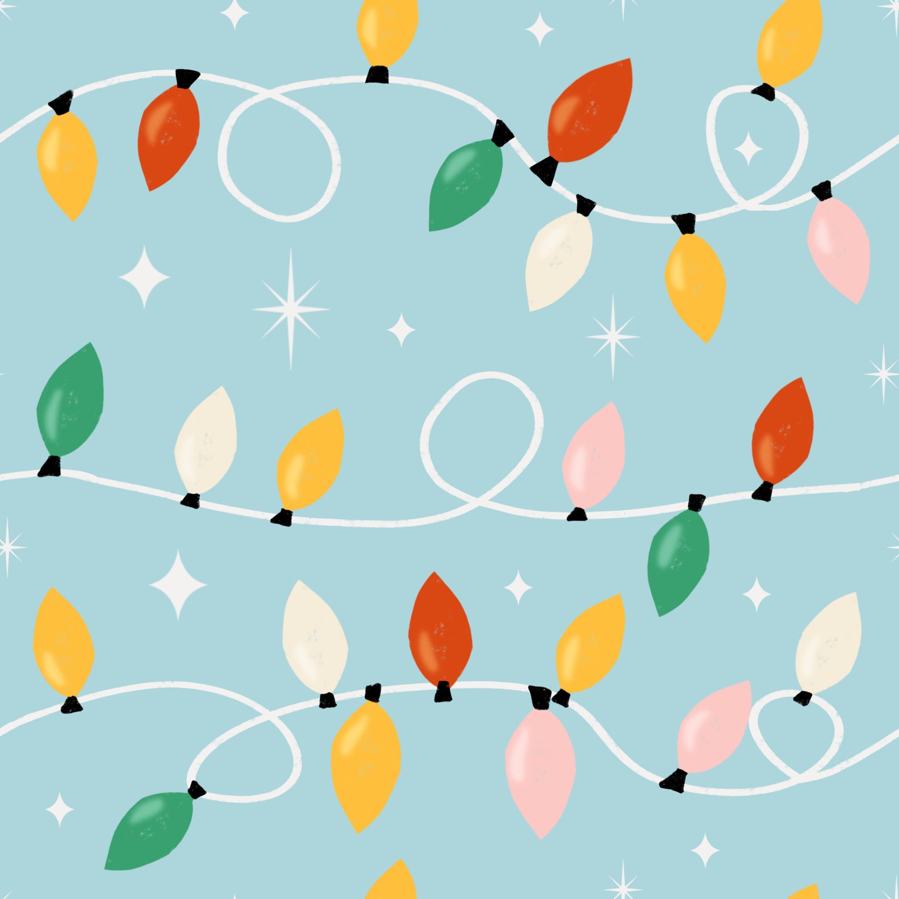 A whimsical wallpaper showcasing vibrant Christmas lights and star accents over a light blue base.