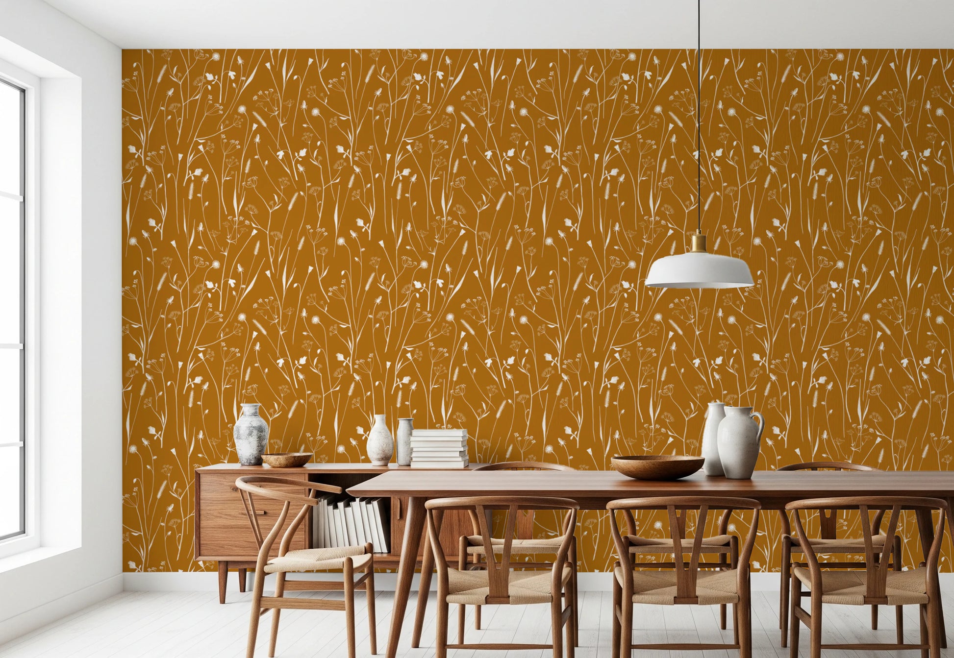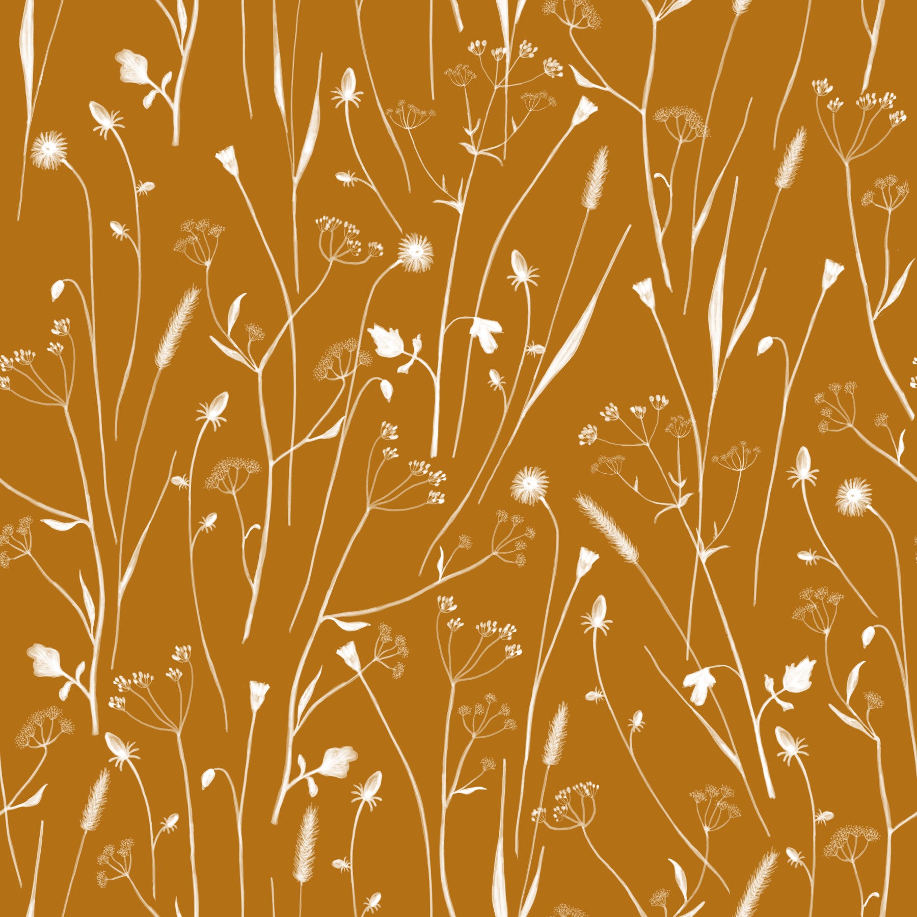 Evoke a sense of serene nostalgia with 'Homeland Floral Golden,' a design that brings the warmth of sun-drenched fields into your living space. This captivating pattern features a delicate array of stylized wildflowers and grasses, rendered in soft, creamy whites against a rich, golden backdrop. The subtle interplay of light and shadow creates a soothing, organic feel, perfect for adding a touch of natural elegance to any room. Its timeless beauty makes it a versatile choice, seamlessly complementing both modern and traditional interiors. Transform your walls into a canvas of enduring style with this homage to simple, pastoral beauty.