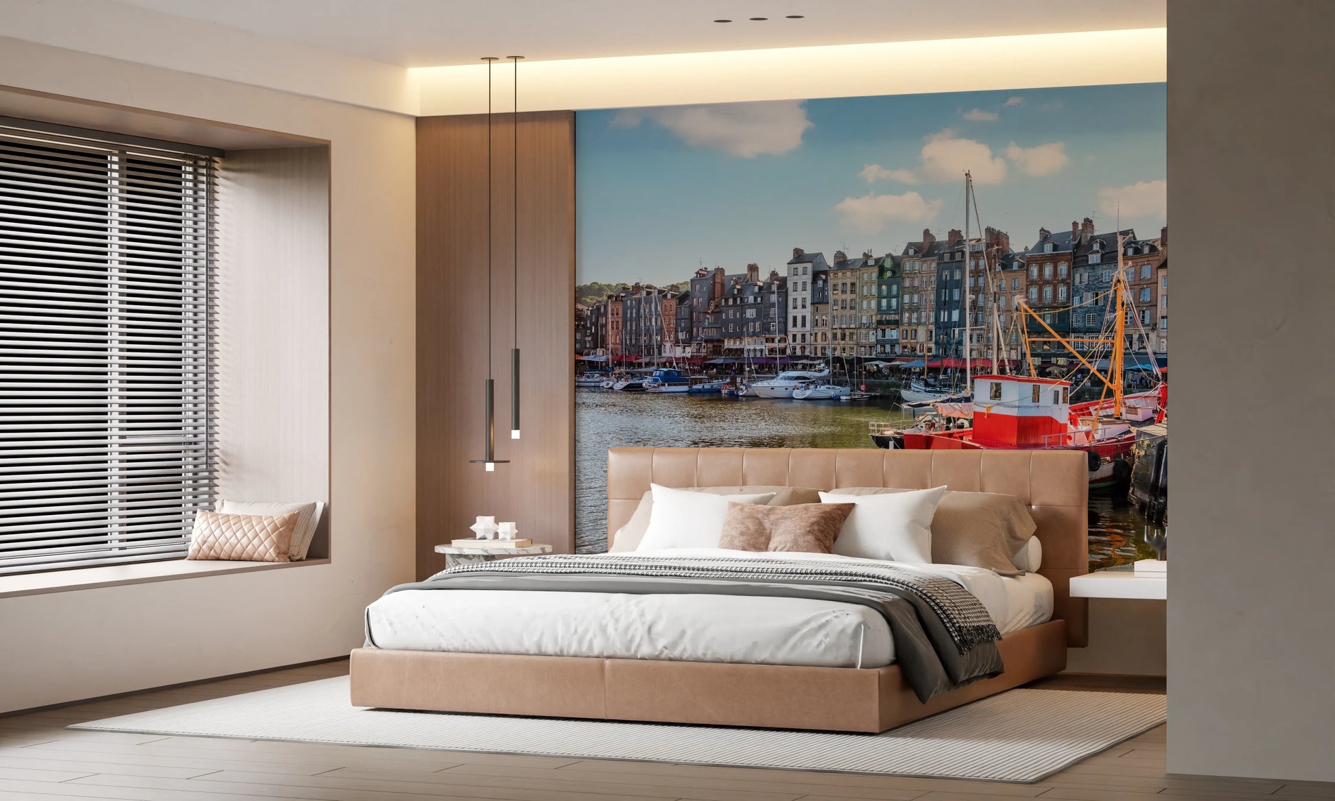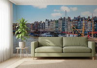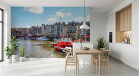 Bring the picturesque beauty of Honfleur's harbour into your home with this stunning wallpaper for walls. Vividly coloured buildings line the waterway, while classic boats bob gently in the water. The rich, varied colours create depth and texture. This wallpaper adds a touch of European sophistication to living rooms, dining rooms, or hallways. It enhances spaces with a calming, inviting scene, capturing the essence of a quaint harbour town. The overall effect is a blend of vibrancy and tranquility, perfect for creating a feature wall.
