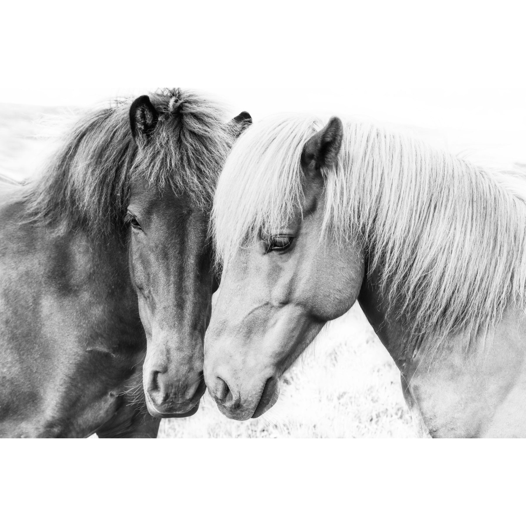 A breathtaking monochrome image capturing the tender intimacy between two Icelandic horses. Their heads gently nuzzle, showcasing a profound connection and unspoken affection. The soft, flowing manes and the contrast between their dark and light coats create a visually stunning composition. This wallpaper evokes feelings of peace, serenity, and the deep bond between animals, perfectly encapsulating the theme of 'Horse Love'. The minimalist, black-and-white palette adds a timeless elegance, making it a sophisticated and calming addition to any digital space.