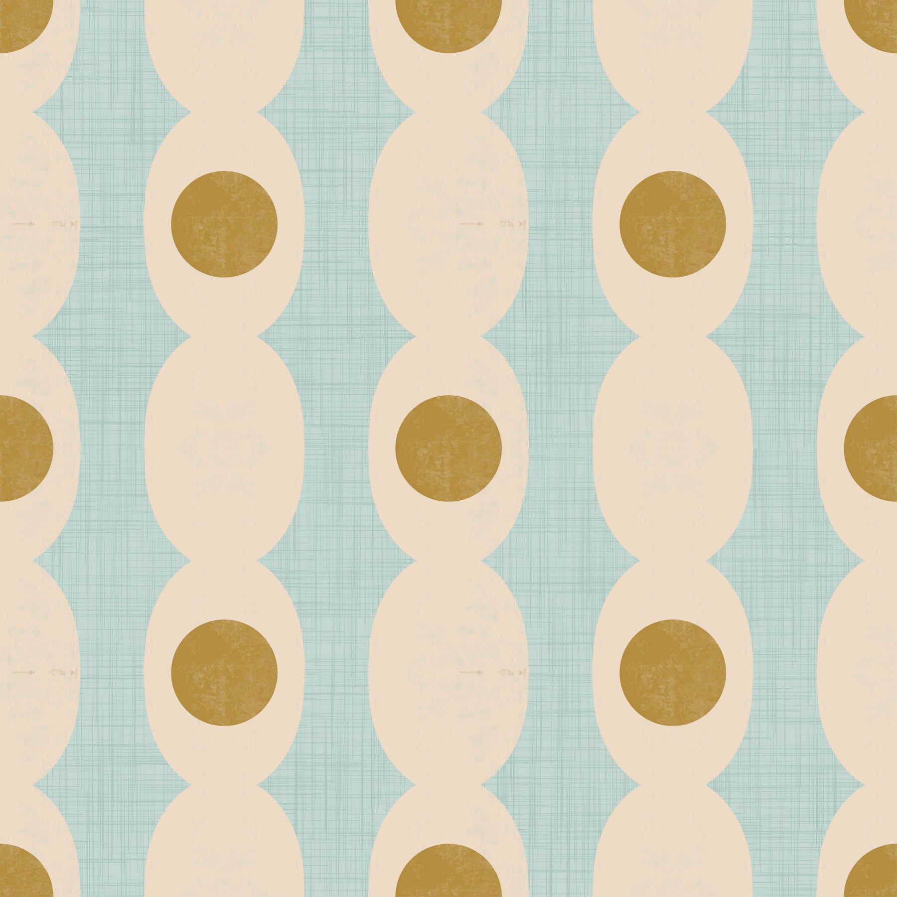 Elevate your home decor with this elegant hourglass pattern. Pale beige shapes frame mustard-coloured circles, creating a balanced design. Light blue adds a subtle, woven texture to the background. This wallpaper for walls brings a touch of sophistication to any room. Its versatile style suits a variety of spaces, from living rooms to dining rooms. The wallpaper’s neutral palette ensures it coordinates with different furnishings. The clean design complements modern interiors and brightens up spaces with a soft glow.