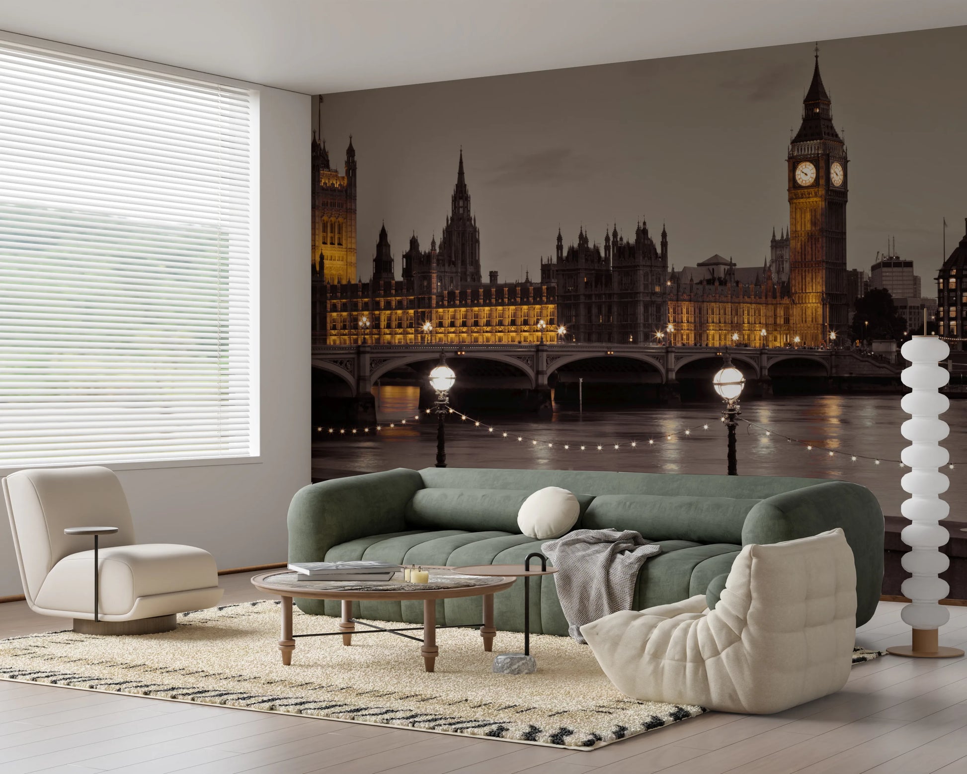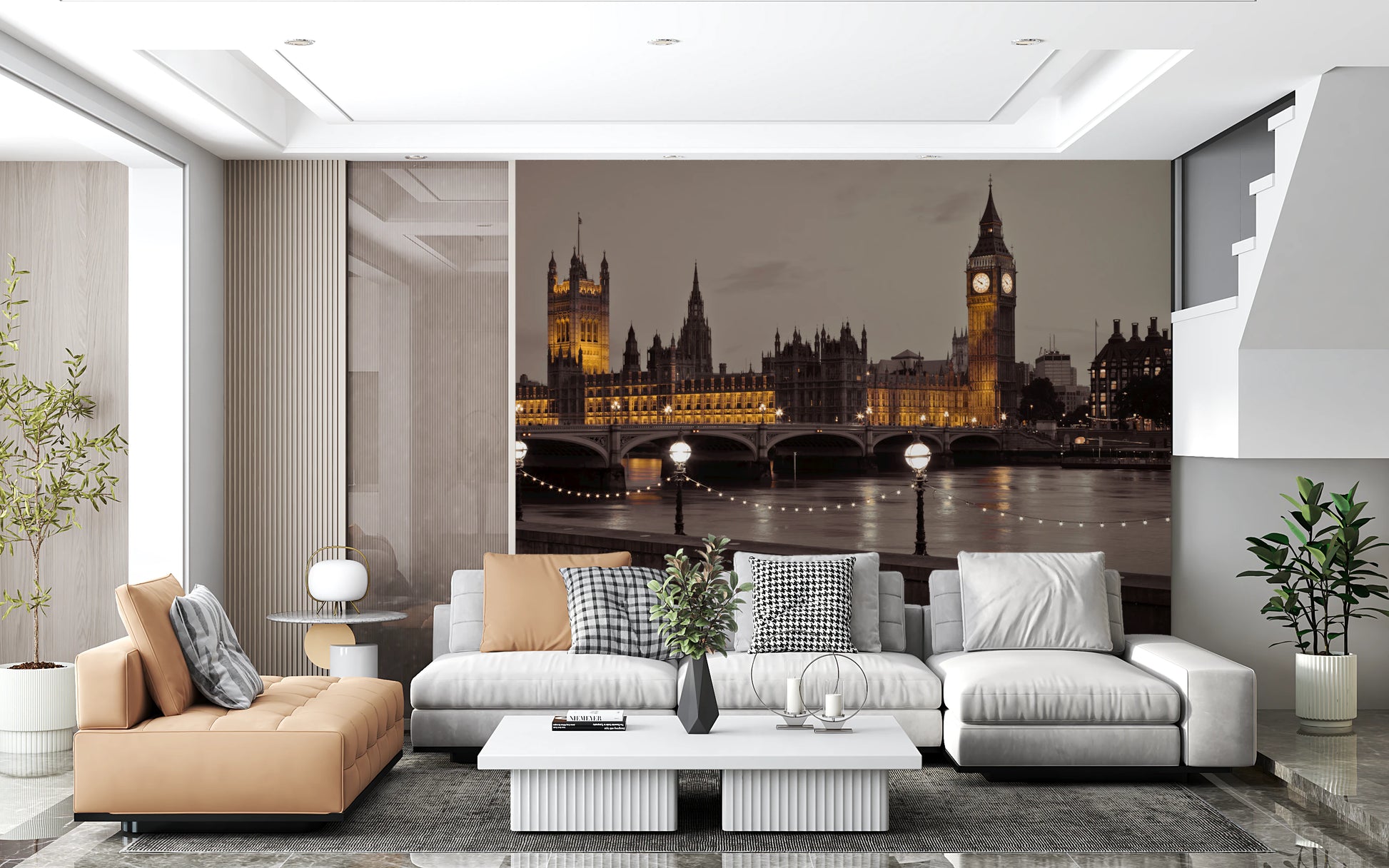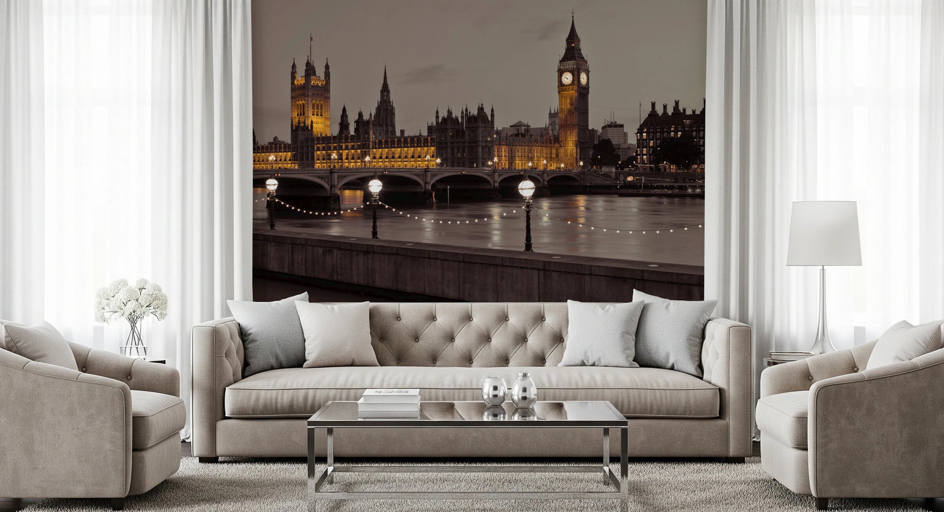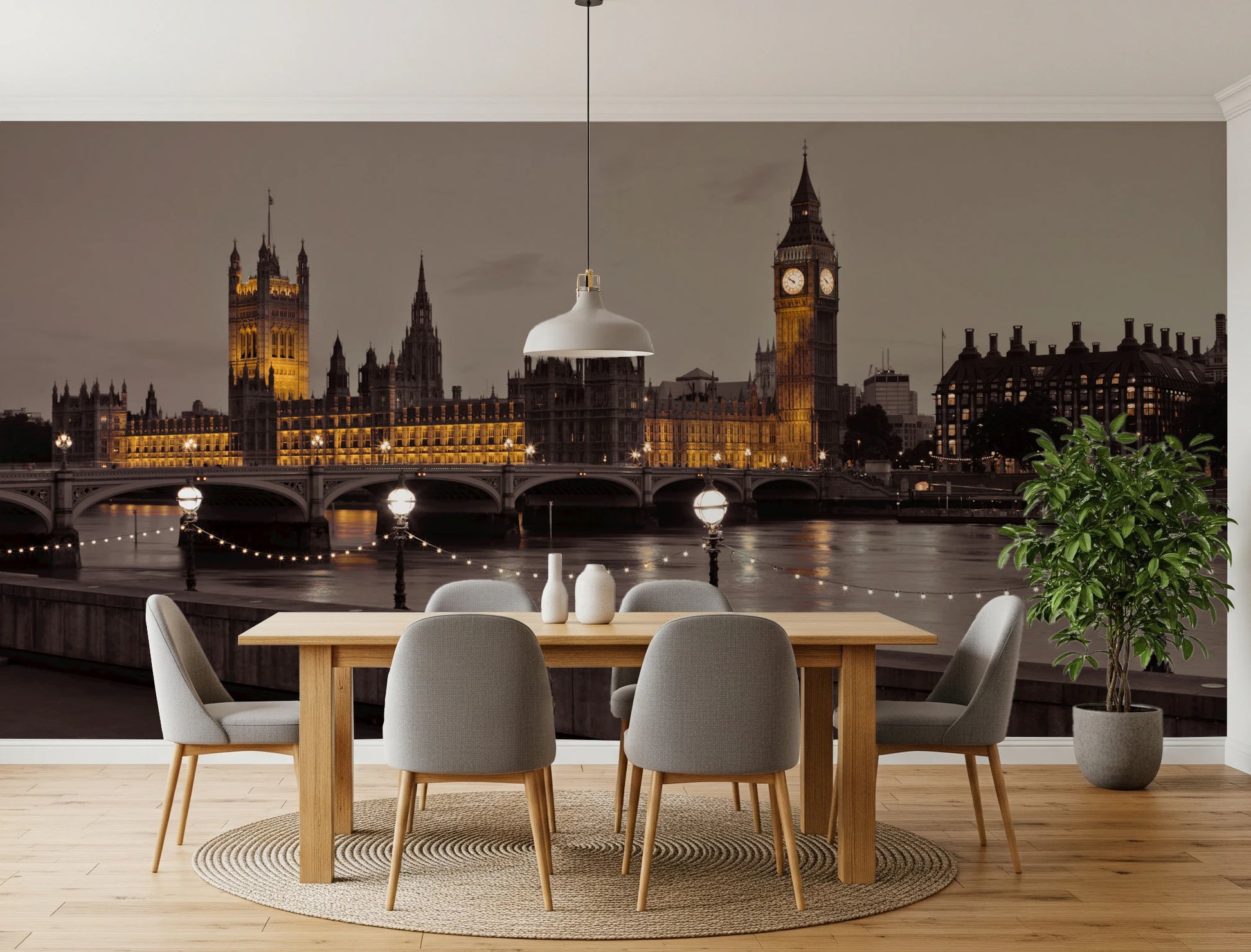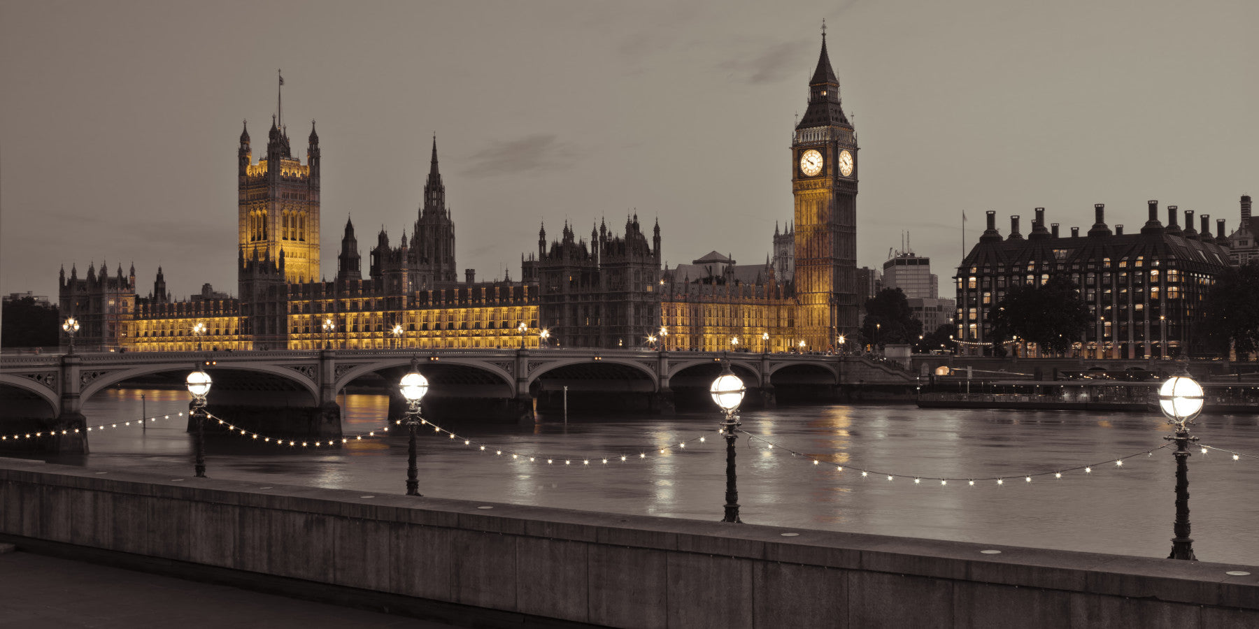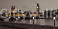 Introduce an air of timeless elegance with this captivating depiction of the Houses of Parliament. Bathed in the warm glow of evening light, the iconic structure and its majestic clock tower, Big Ben, command attention. The image captures the architectural grandeur and historical significance of this landmark, softened by the gentle shimmer of the river Thames. Illuminated lamp posts and delicate string lights add a touch of magic, reflecting on the water's surface and creating a serene, atmospheric ambiance. Perfect for adding a sophisticated touch to any room, this piece brings a sense of history, culture, and understated luxury to your space.