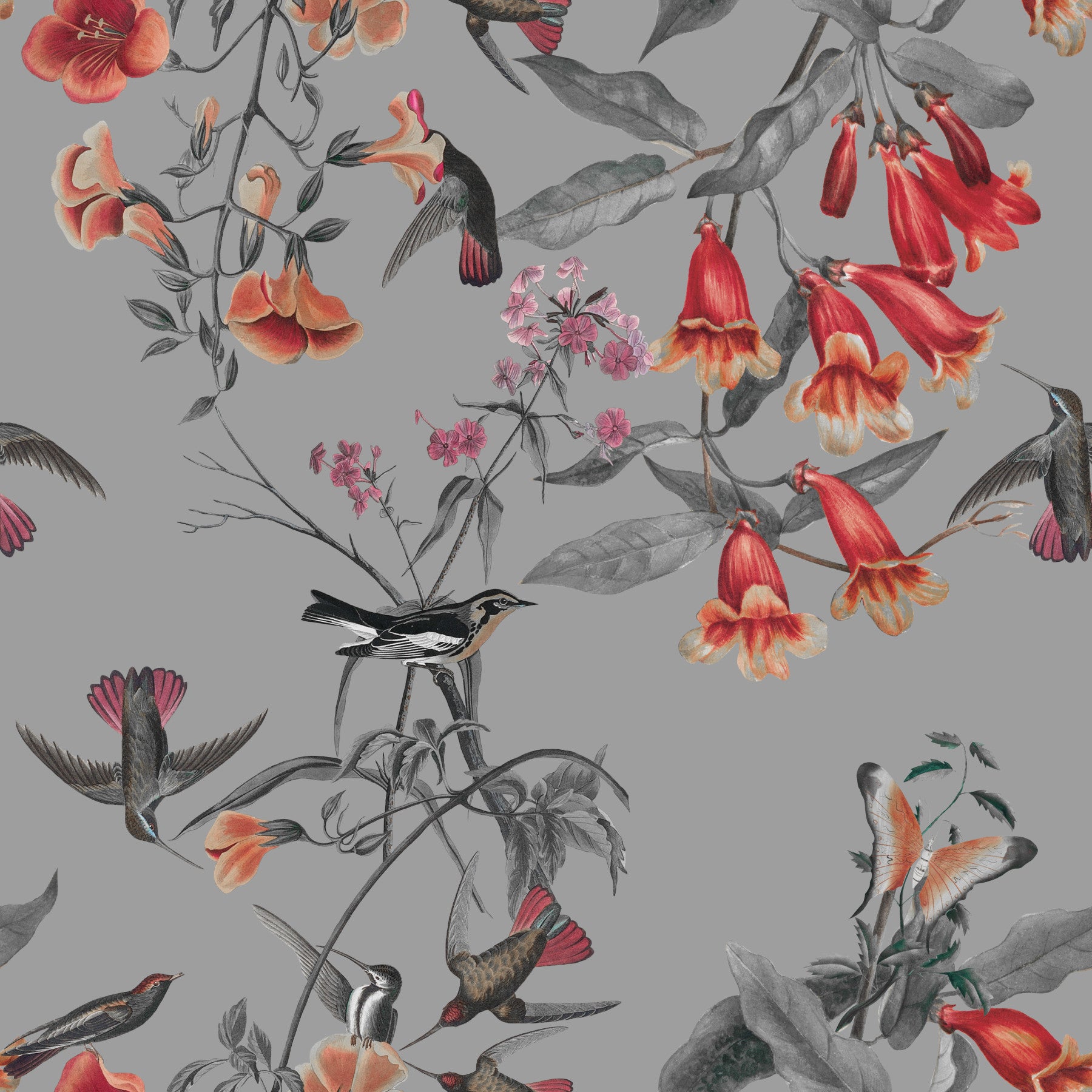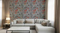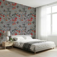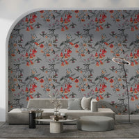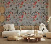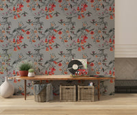 Transform your space with this enchanting floral and fauna design. See vivid blooms in shades of coral against grayscale foliage, while delicate birds bring life to the pattern. This wallpaper for walls adds refinement to any room, from bedrooms to hallways. The design works especially well in rooms seeking a touch of nature. Enhance your interiors with timeless beauty and serenity.