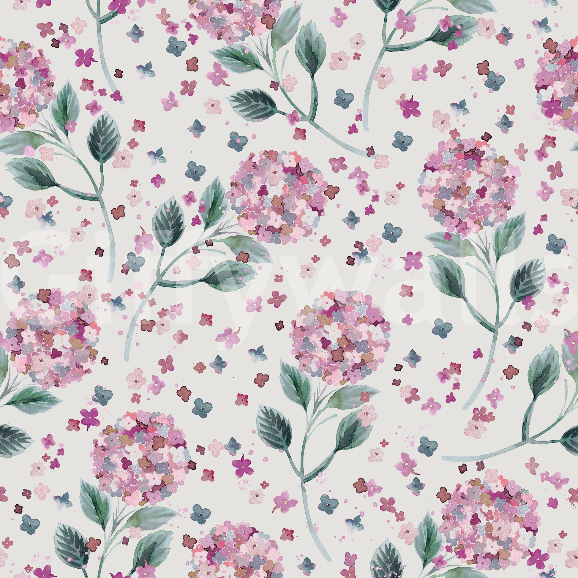 Indulge in the serene beauty of this vintage-inspired wallpaper. Delicate watercolor hydrangeas in calming shades of magenta, pink, and lavender bloom amidst a scattering of smaller wildflowers and soft green leaves. The muted color palette and gentle floral arrangement evoke a sense of tranquility and effortless elegance, perfect for creating a relaxing atmosphere in any digital space. The pattern's subtle texture and artistic watercolor style add a touch of sophistication, making it ideal for those who appreciate both beauty and understated charm.
