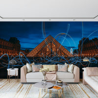 Experience the allure of Paris with this artful design. It features the iconic Louvre Pyramid and a cascade of light, ideal as wallpaper for walls. The vibrant combination of sapphire and gold tones enlivens any room. This wallpaper adds a sense of urban sophistication. Consider it for an entryway, study, or dining room to create a statement. Let the design enhance your decor with a touch of world-class art.
