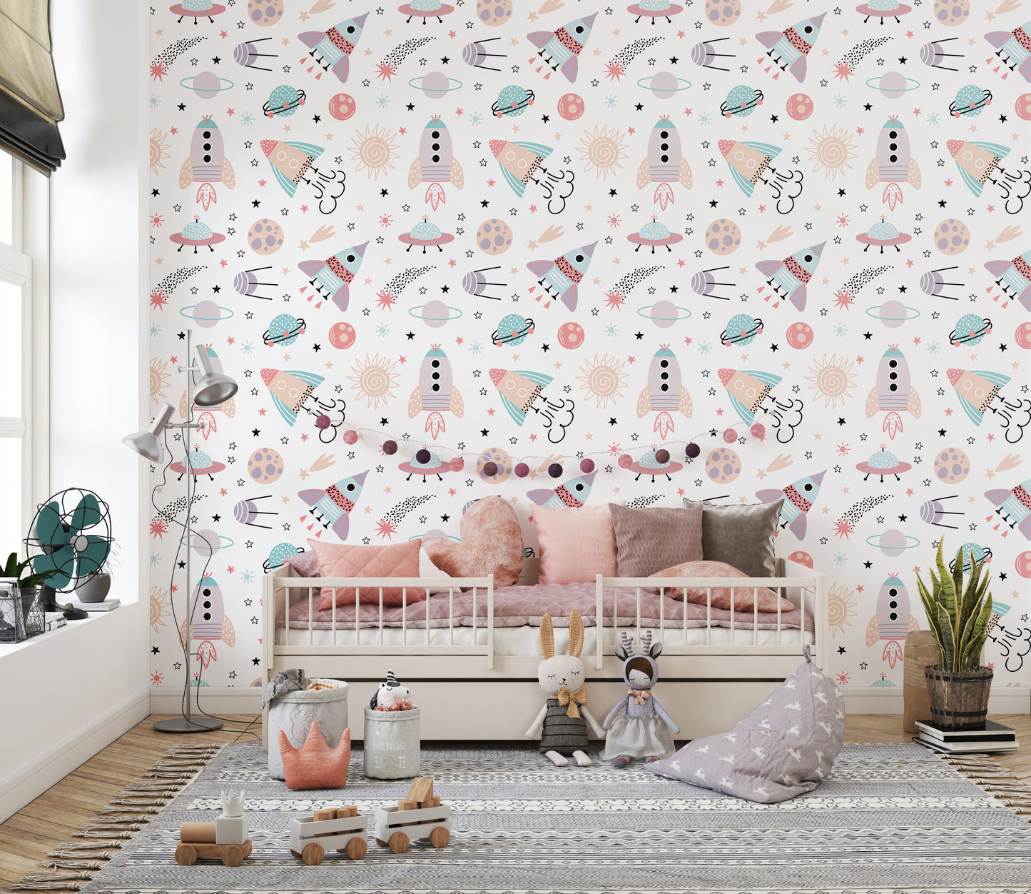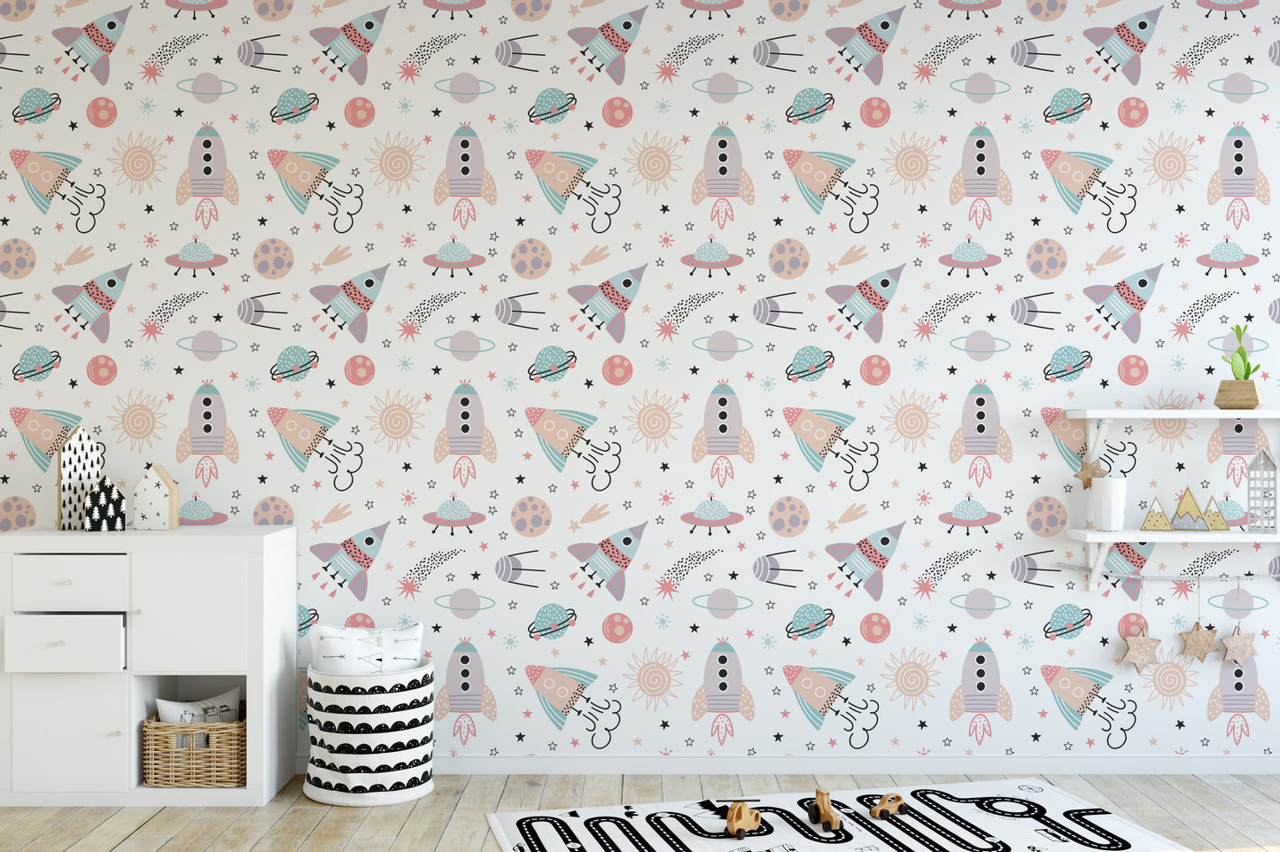 Starry space mural with rocket patterns