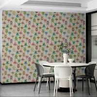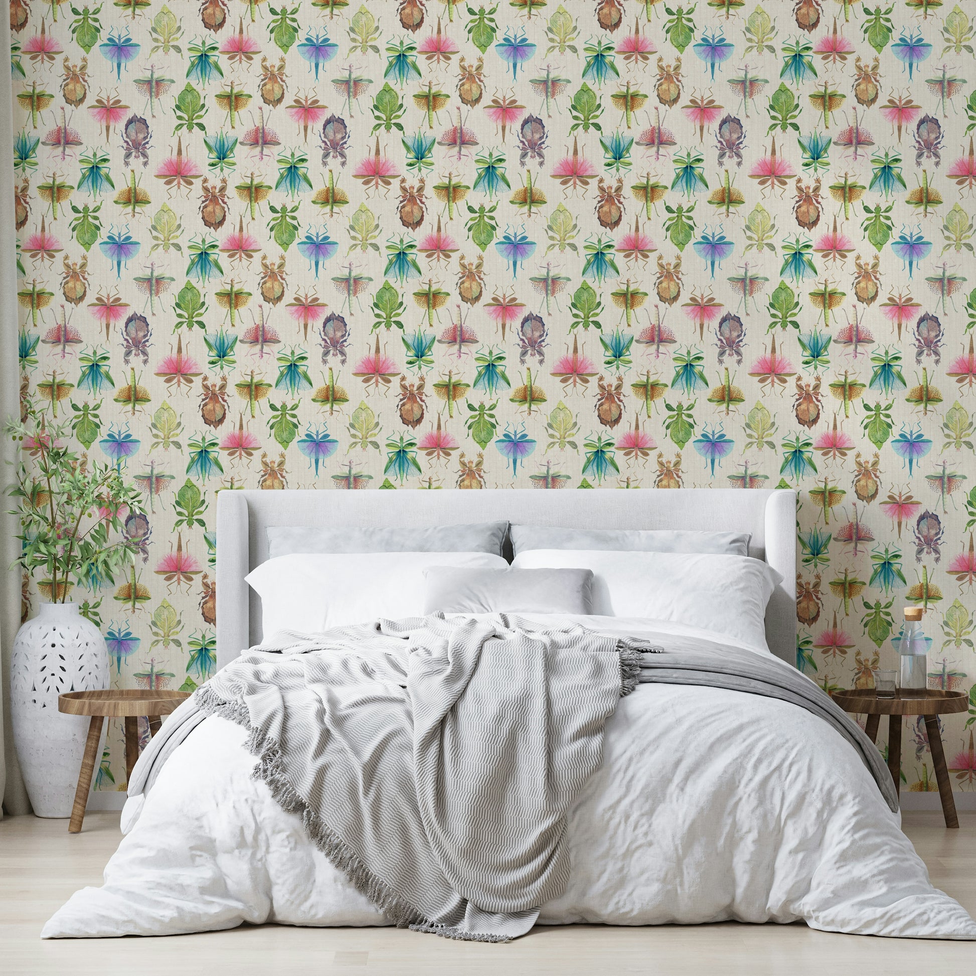 Masterfully rendered stick and leaf insects showcase nature's artistry of camouflage in this captivating wallpaper. A delicate beige background provides the perfect canvas for a vibrant array of insects, each meticulously detailed with watercolor-like precision. From leafy greens and browns to vibrant pinks and blues, the insects' wings and bodies mimic leaves, flowers, and even feathers, illustrating their remarkable adaptation. This design blends scientific accuracy with artistic flair, making it a stunning and unique addition to any space. The seamless pattern ensures a cohesive and visually engaging experience, bringing the wonders of the natural world into your home.