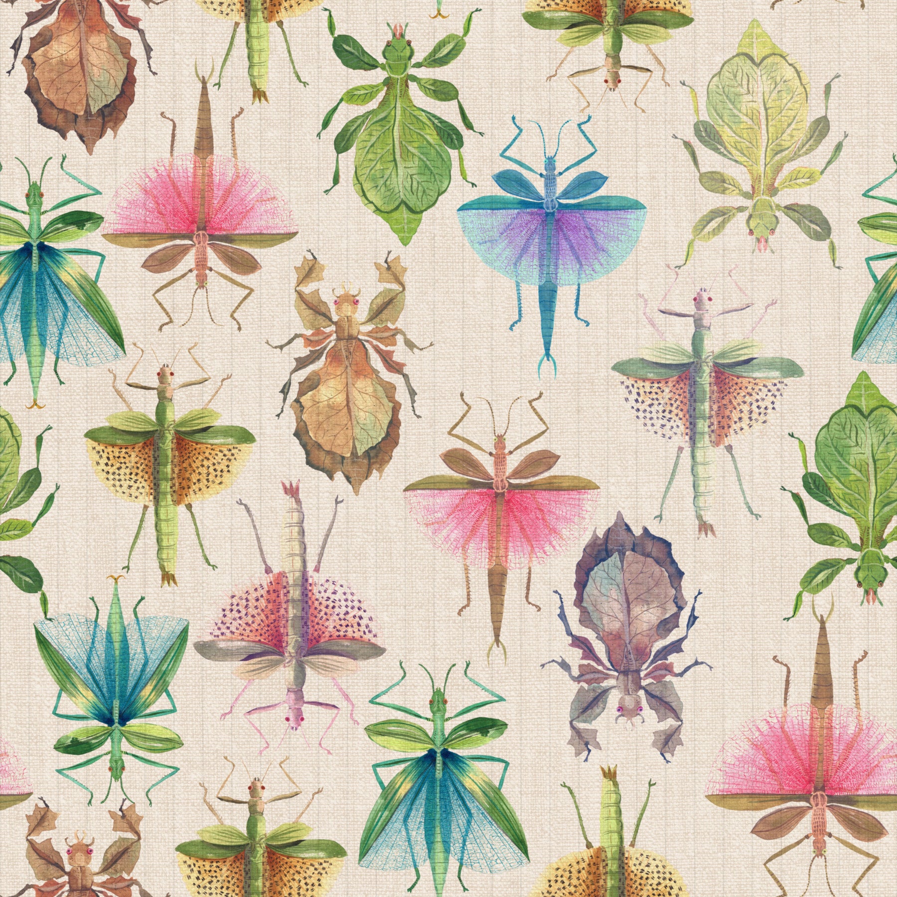 Masterfully rendered stick and leaf insects showcase nature's artistry of camouflage in this captivating wallpaper. A delicate beige background provides the perfect canvas for a vibrant array of insects, each meticulously detailed with watercolor-like precision. From leafy greens and browns to vibrant pinks and blues, the insects' wings and bodies mimic leaves, flowers, and even feathers, illustrating their remarkable adaptation. This design blends scientific accuracy with artistic flair, making it a stunning and unique addition to any space. The seamless pattern ensures a cohesive and visually engaging experience, bringing the wonders of the natural world into your home.