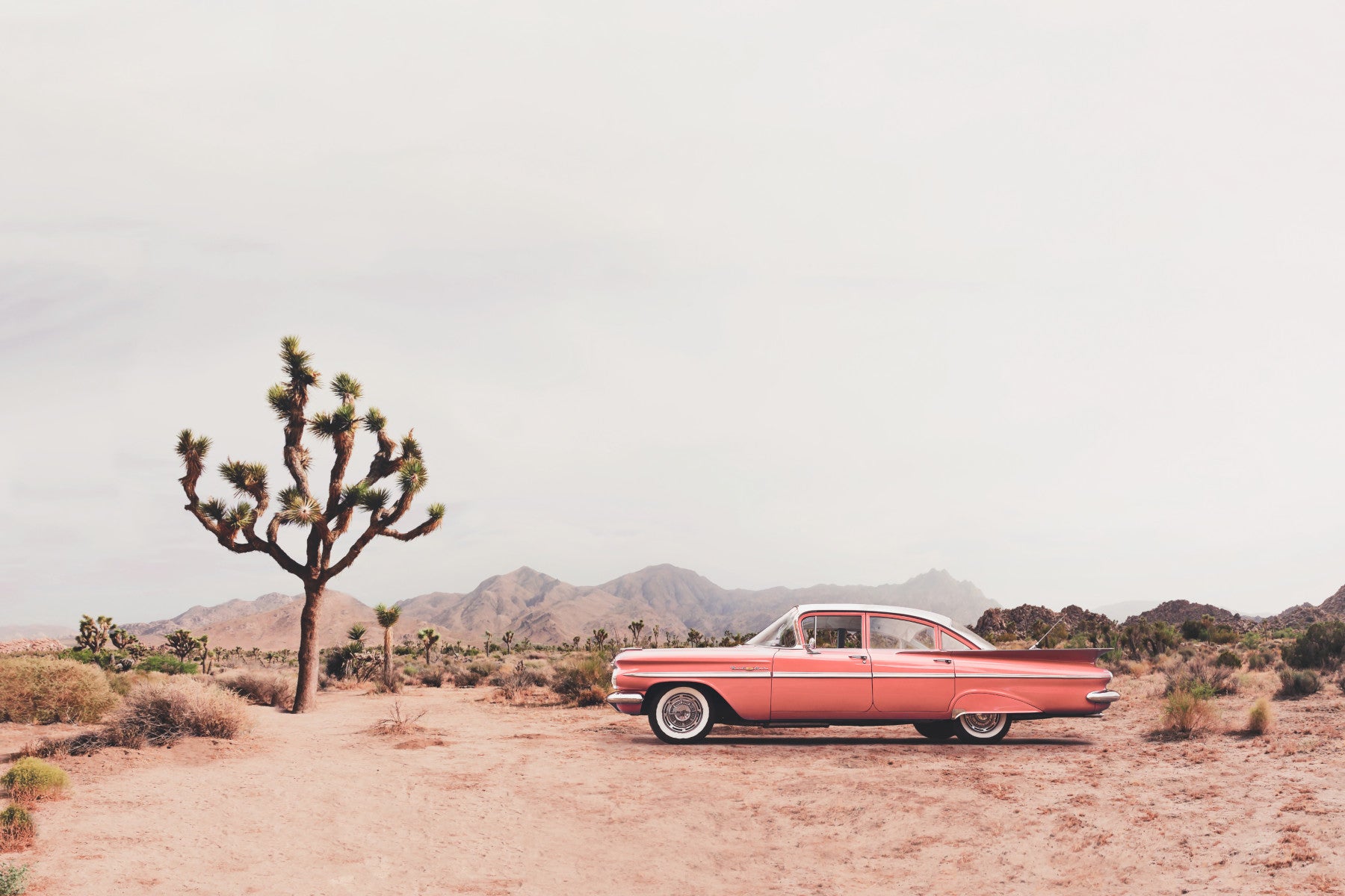 This wallpaper transports you to a sun-drenched desert with a classic car parked beside a Joshua Tree. The muted, earthy tones of the landscape beautifully contrast with the car's coral pink hue. This wallpaper for walls brings a touch of vintage Americana to any space. It is a good choice for living rooms, bedrooms, or home offices, where its peaceful vibe can promote a relaxed, yet stylish environment. The neutral background ensures it complements most interior styles.
