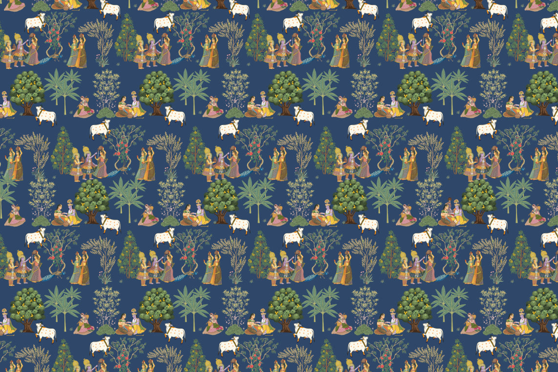 Experience the elegance of the Indian folk art wall mural inspired by Mughal art wallpaper and cultural heritage wallpaper designs. The rich patterns, traditional figures, and nature-inspired elements create a timeless aesthetic. Featuring intricate details and vibrant colors, this vintage Indian pattern wallpaper blends history with modern interiors. Crafted precisely, it showcases traditional motifs, lush greenery, and graceful figures. Ethnic decorative mural designs bring an authentic touch to interiors. The deep blue background enhances the fine details, making every element stand out. Perfect for adding a regal touch, this royal Mughal design wallpaper reflects India's artistic legacy.