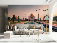 Transform your space with the majestic allure of India's Taj Mahal. This architectural marvel is presented through its reflecting water, framed by lush greenery and birds gliding overhead. This wallpaper for walls brings the splendour of this historical site into your home. The serene ambiance makes it great for a meditation space, reading room, or any area where you want to promote calmness. Its versatile design easily blends with both modern and traditional décor.