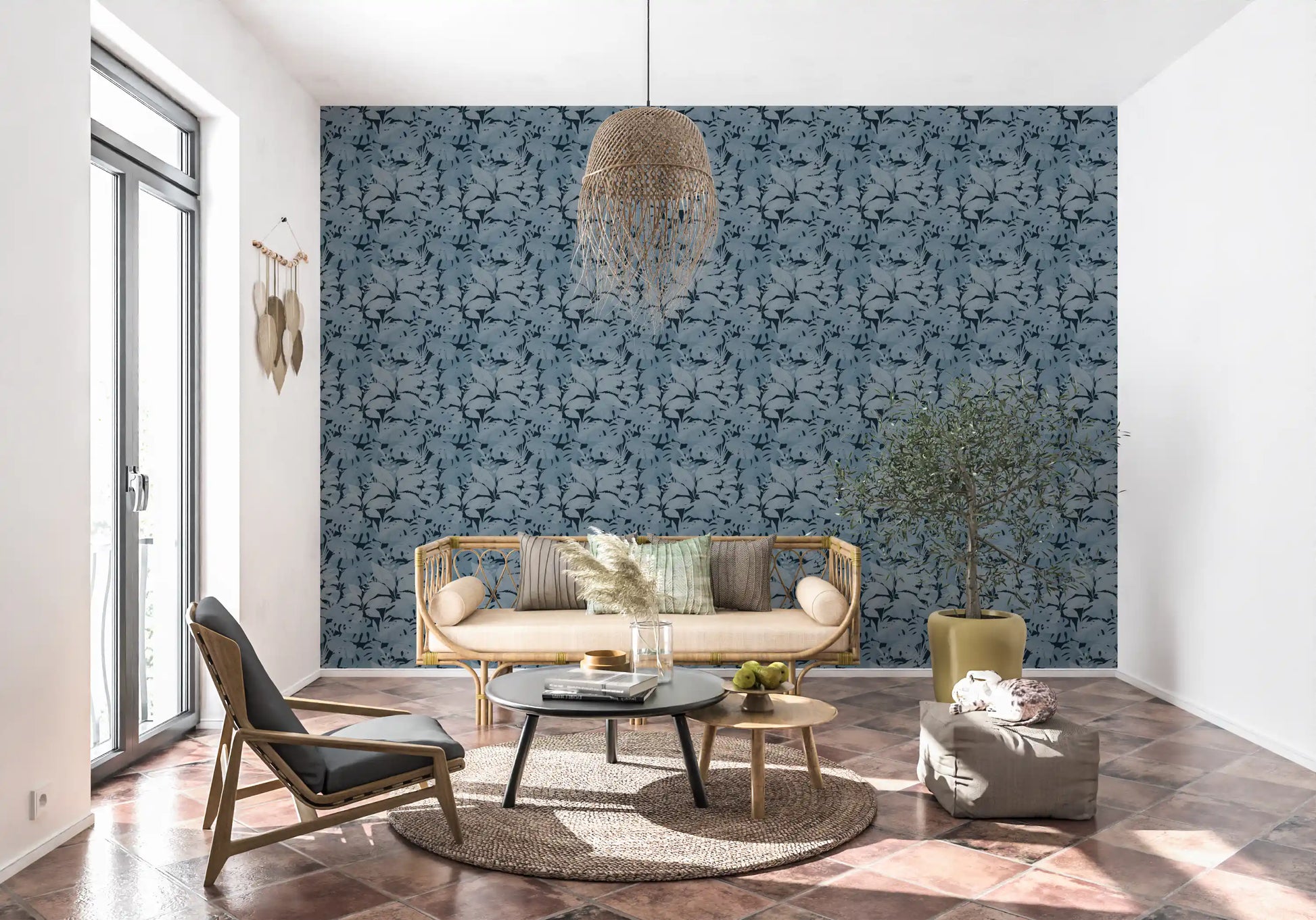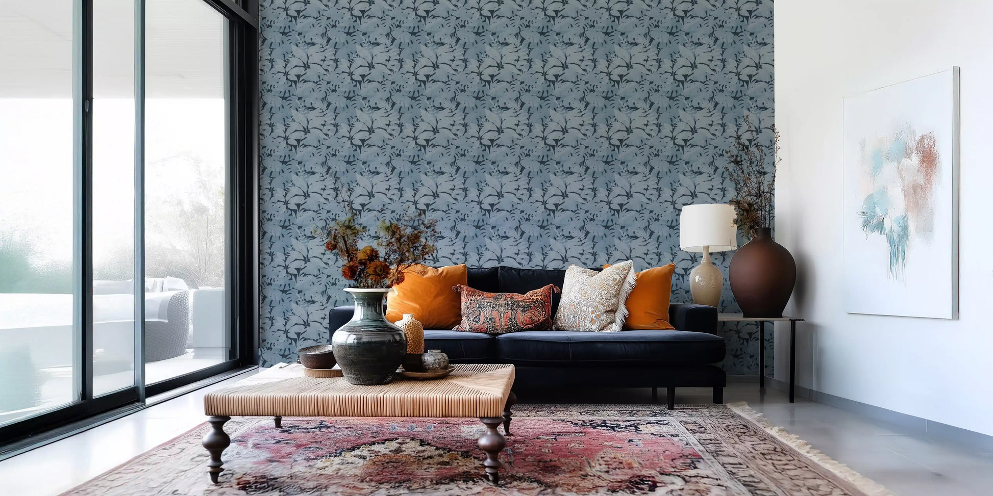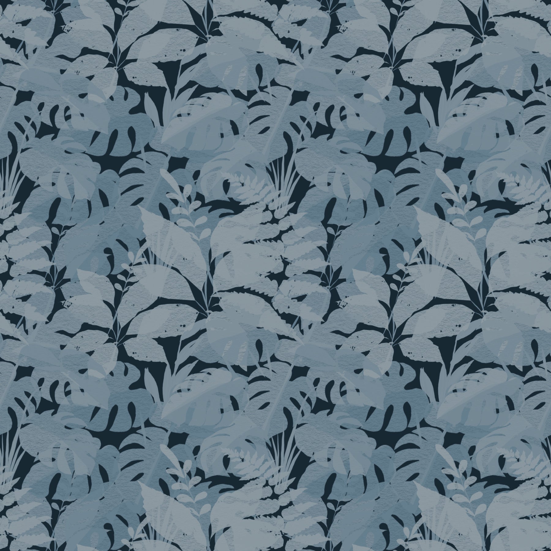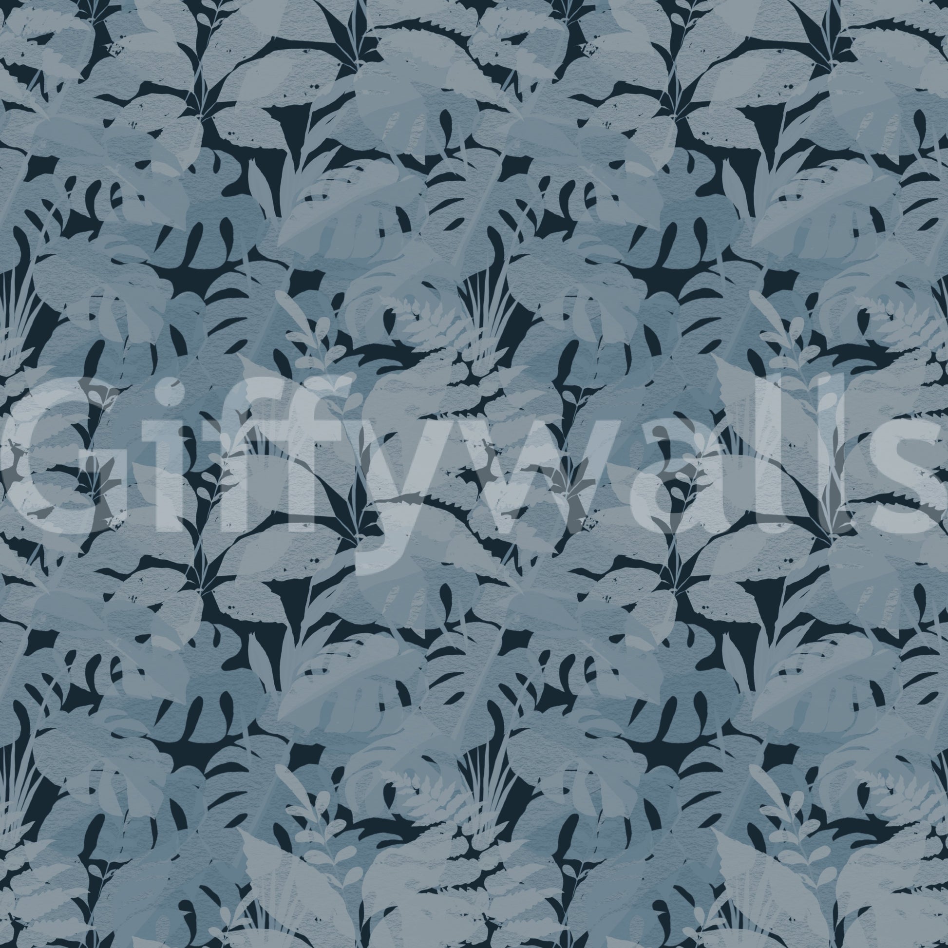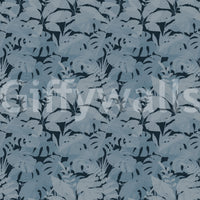 Transform your interior with this striking botanical wallpaper for walls. Its design features a captivating array of layered tropical leaves, creating a sense of depth and organic movement across your space. The nuanced texture within each leaf shape adds a tactile dimension, enriching the visual appeal. A sophisticated monochromatic palette of muted blues and deep indigo imbues rooms with calm elegance. This modern pattern enhances living rooms, bedrooms, or dining areas by introducing a serene, natural aesthetic. It also creates a tranquil atmosphere in a home office or a luxurious feel in a bathroom. The subtle yet intricate foliage design offers a timeless backdrop, complementing various decor styles.