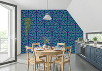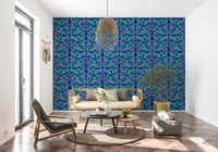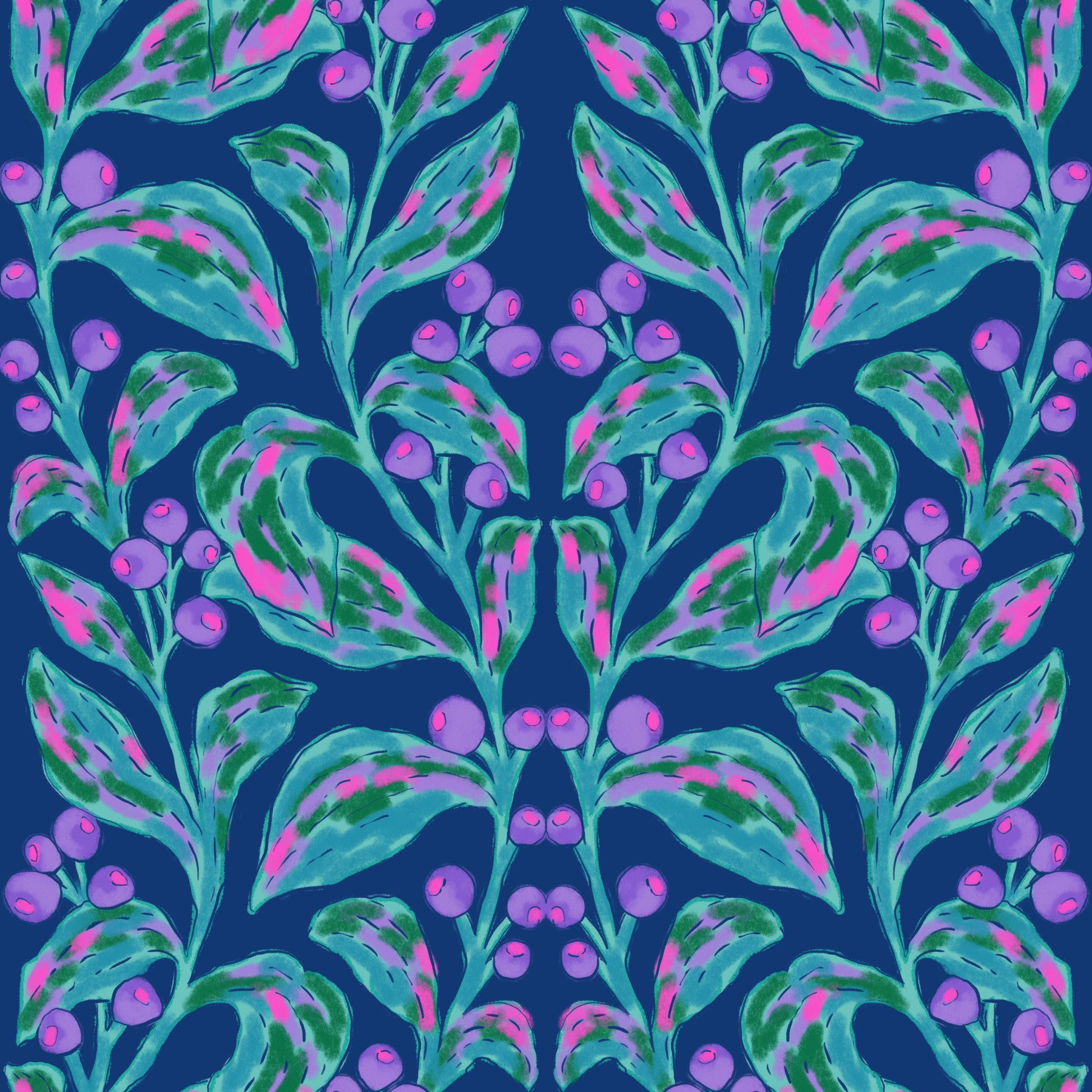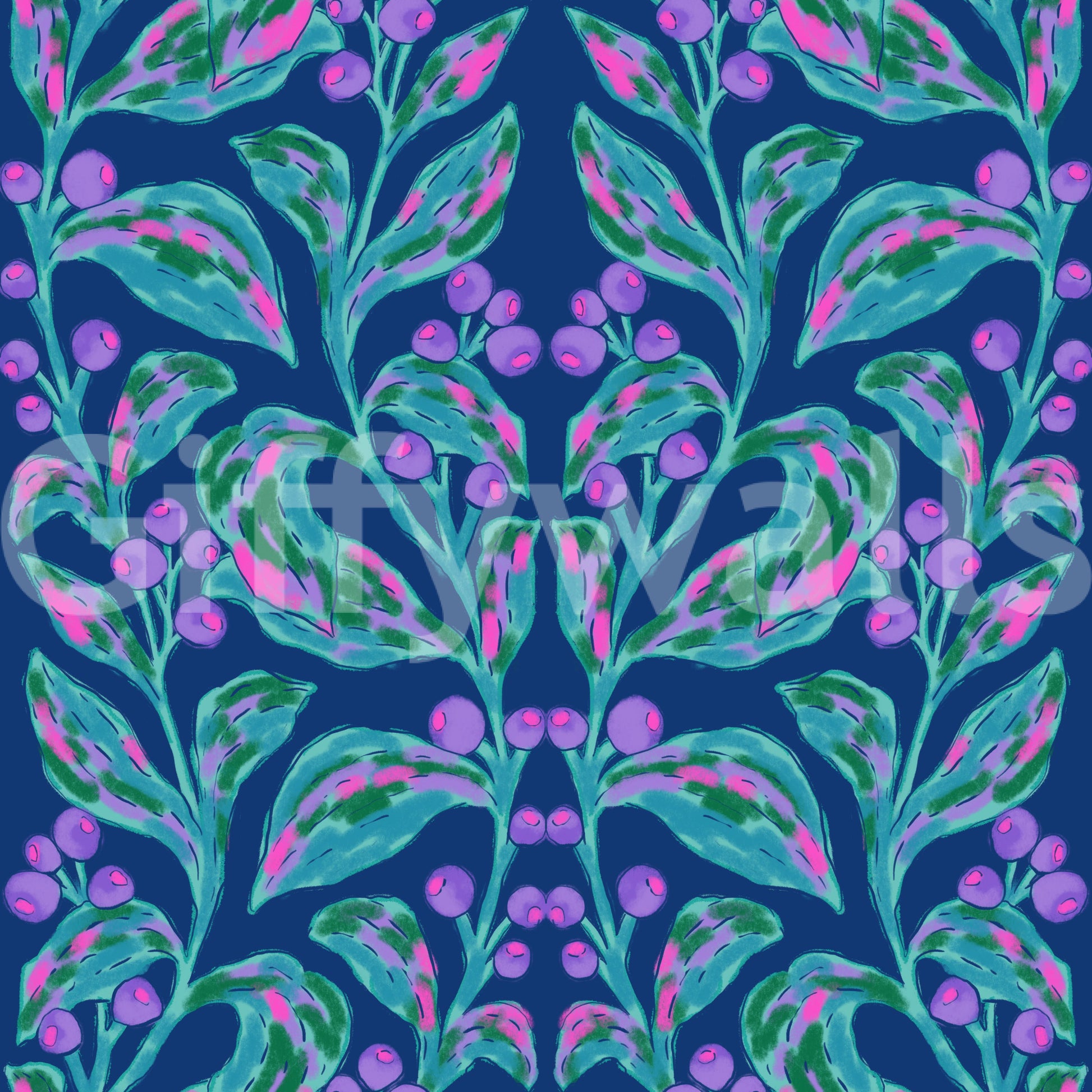 Transform your living space with this enchanting floral design. Featuring watercolour-style leaves and striking violet berries against a deep indigo backdrop, this wallpaper for walls adds a touch of modern elegance to any room. The painterly texture and symmetrical composition generate a sense of calm and sophistication. The rich colour palette works well in bedrooms, dining rooms, or hallways, creating a tranquil yet stylish atmosphere. Make a statement with this captivating botanical design and infuse your home with natural beauty.