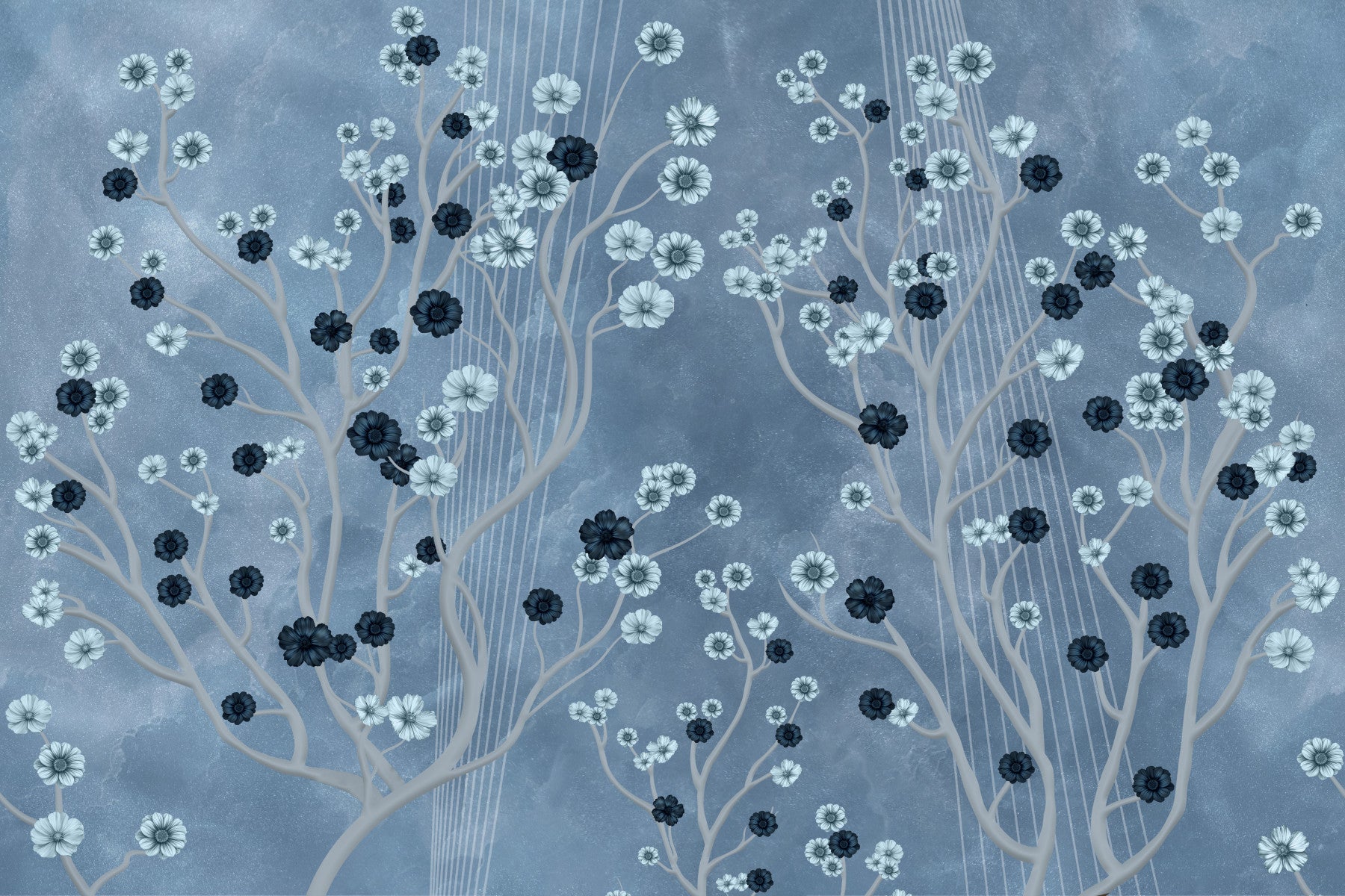 Indigo flower canopy mural in living room, calm modern colour