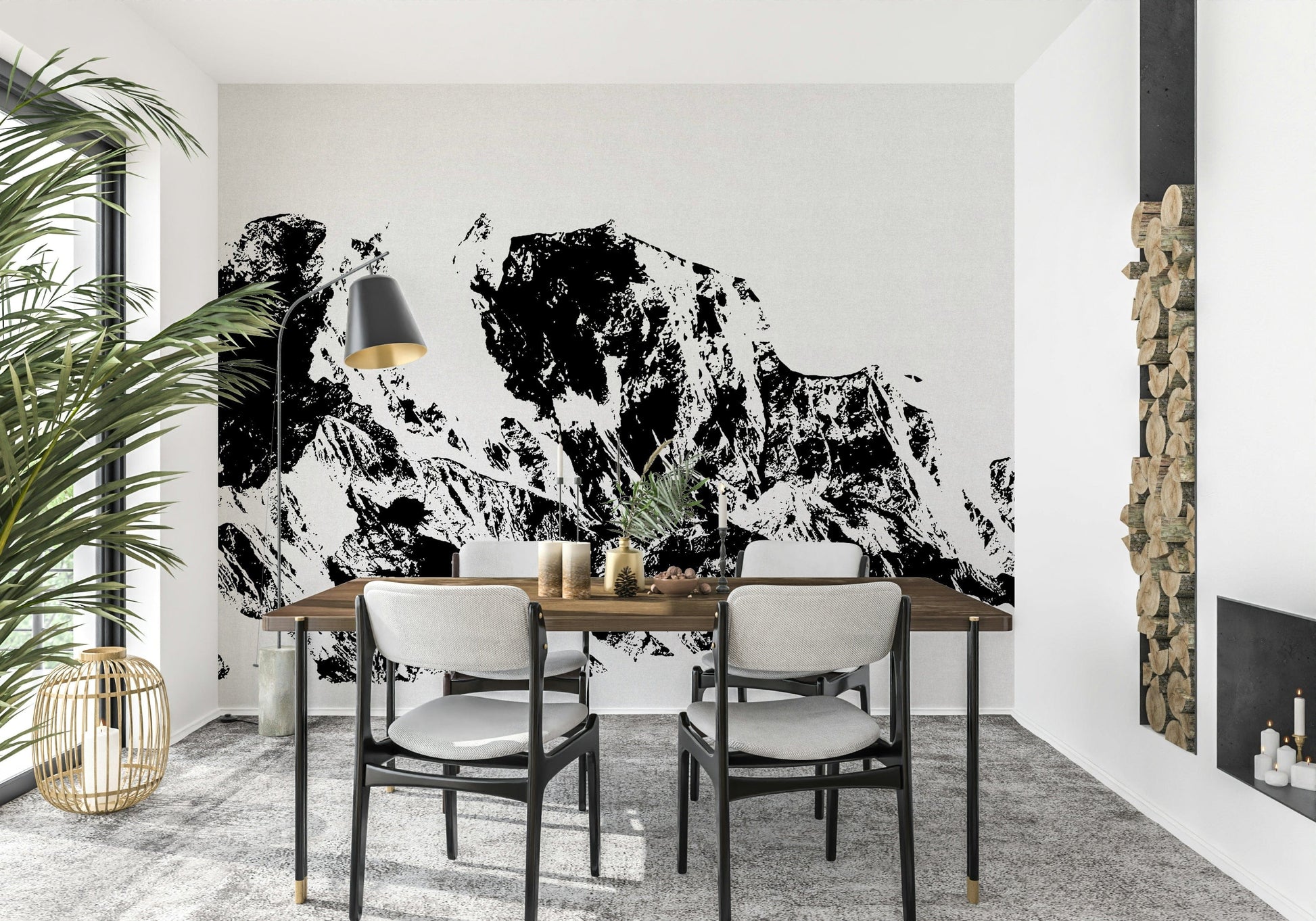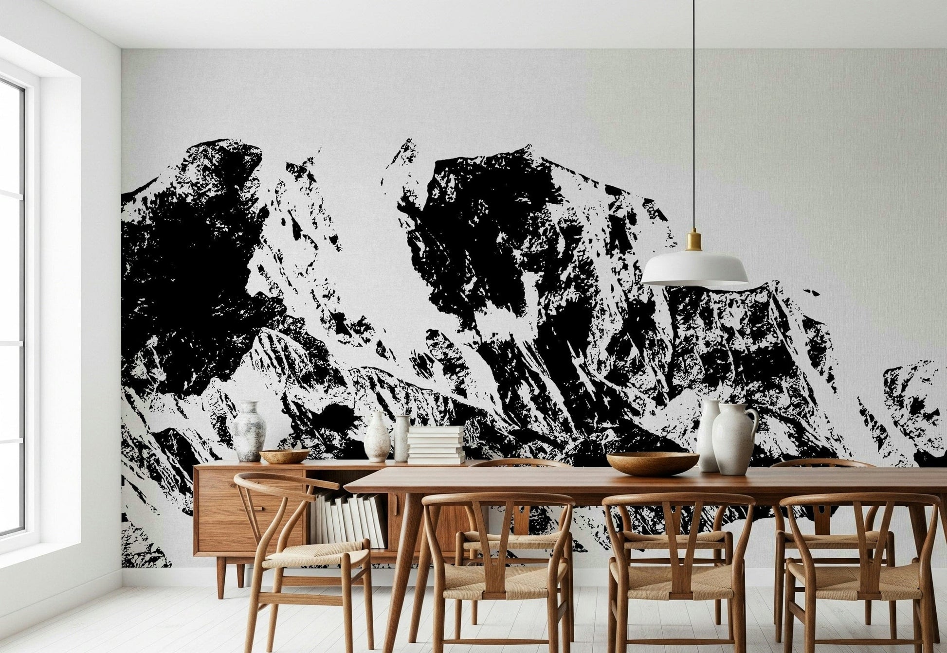 Transform any space with this eye-catching mountain-inspired wallpaper for walls. The powerful contrast between black ink and a white background gives a contemporary edge to this natural motif. Its design brings a bold, artistic touch to any room. Imagine this in a modern living room, a minimalist bedroom, or even a creative office space. Let this landscape inspire exploration and inject visual intrigue into your interiors.