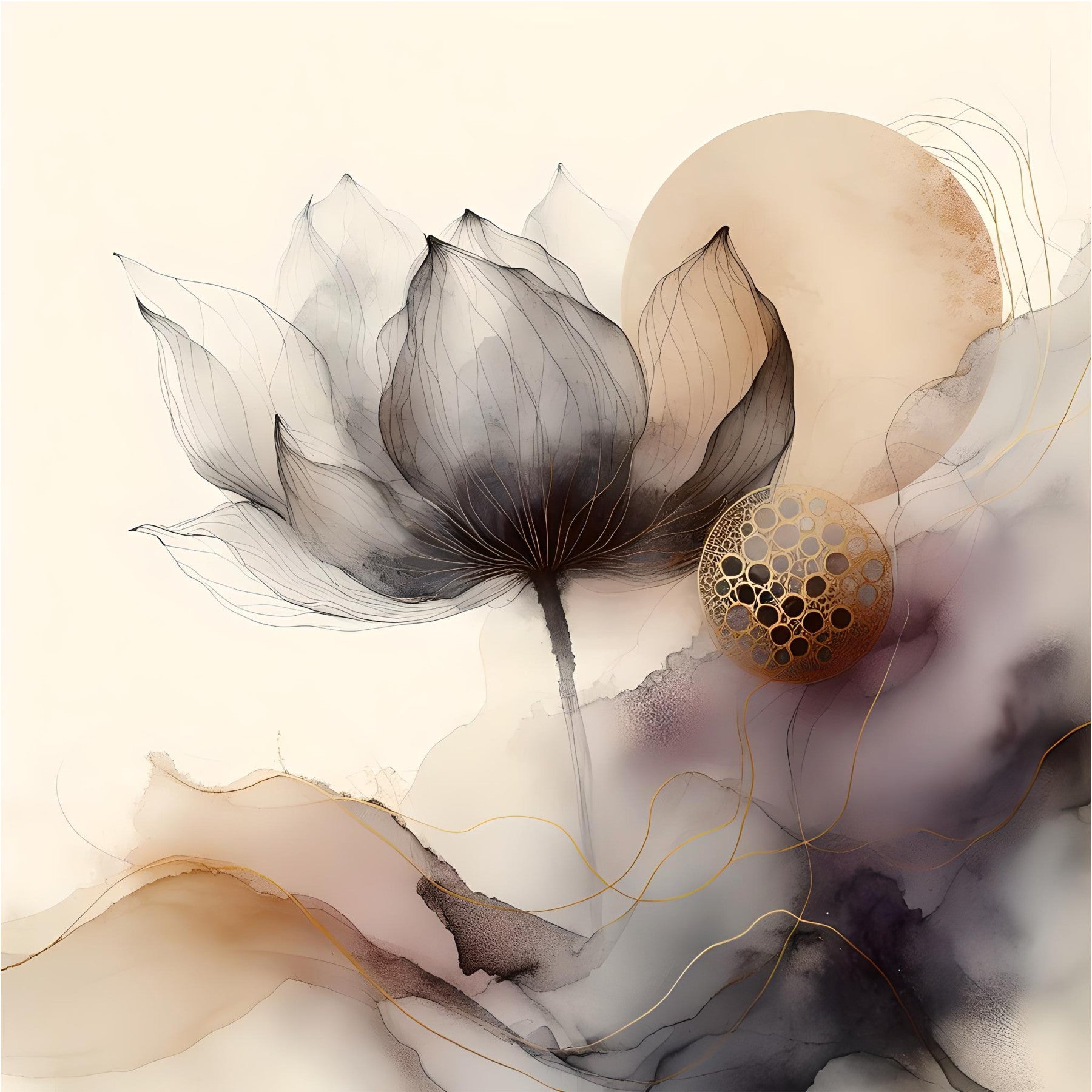 This wallpaper evokes a sense of tranquility and peace. Delicate, translucent lotus flowers in shades of gray and black are the focal point, their intricate details accentuated by fine lines. Subtle blush pink and beige watercolor washes create a soft, dreamy backdrop, while elegant gold accents add a touch of luxury. The overall effect is calming and sophisticated, perfect for a serene living space or bedroom. The abstract design incorporates elements of nature and art, making it a visually appealing and calming choice for any room.