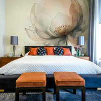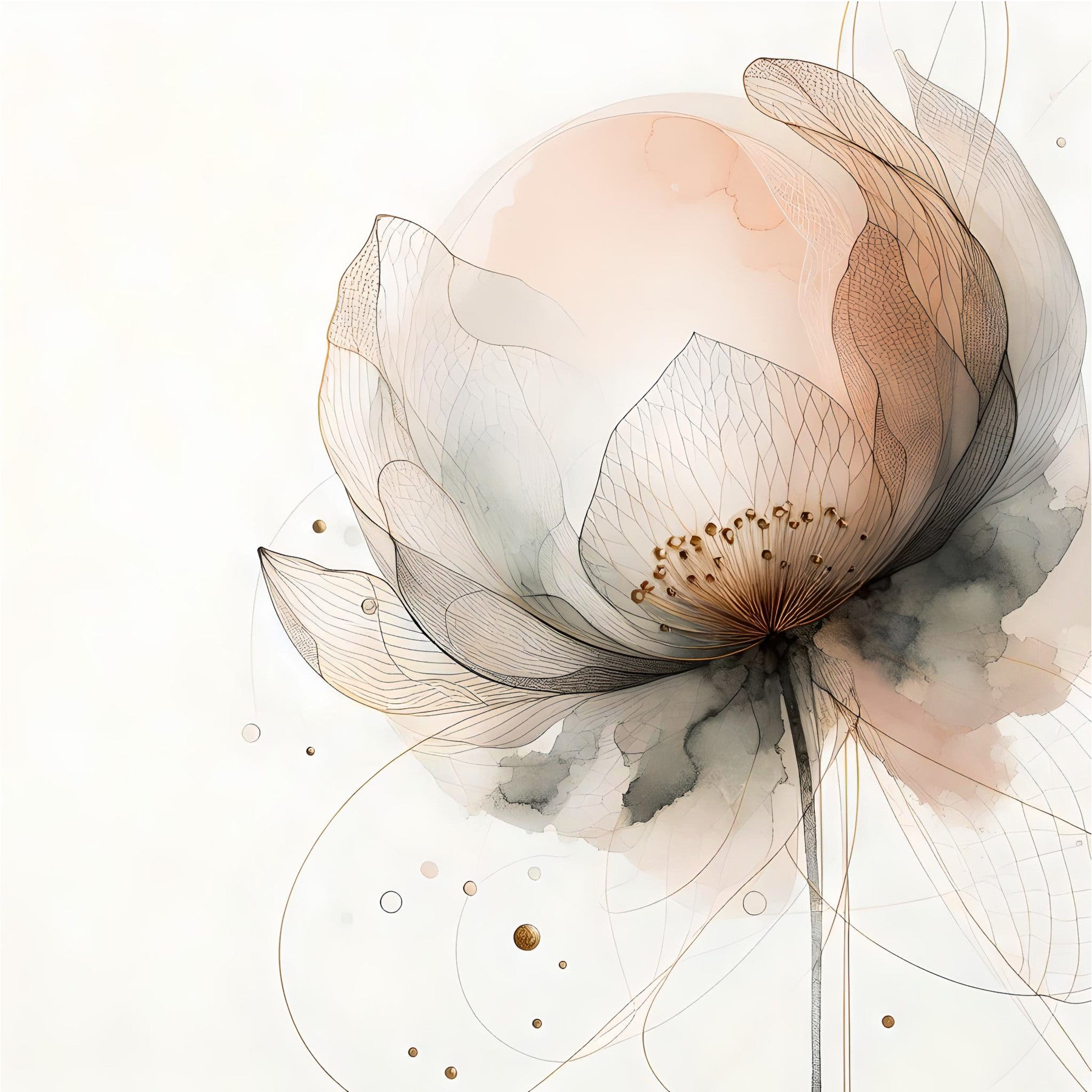 This wallpaper presents a captivating fusion of watercolor and line art, depicting a delicate, ethereal flower. The intricate linework details the flower's translucent petals, creating a lace-like effect, while soft watercolor washes in blush pinks, muted greys, and hints of gold provide a dreamy, atmospheric backdrop. Gold accents add subtle touches of luxury and elegance, enhancing the overall refined and sophisticated aesthetic. The artwork evokes feelings of tranquility and serenity, making it ideal for creating a calm and peaceful atmosphere in any room.