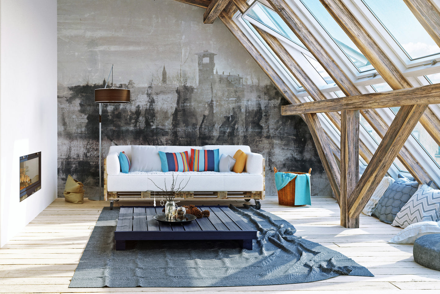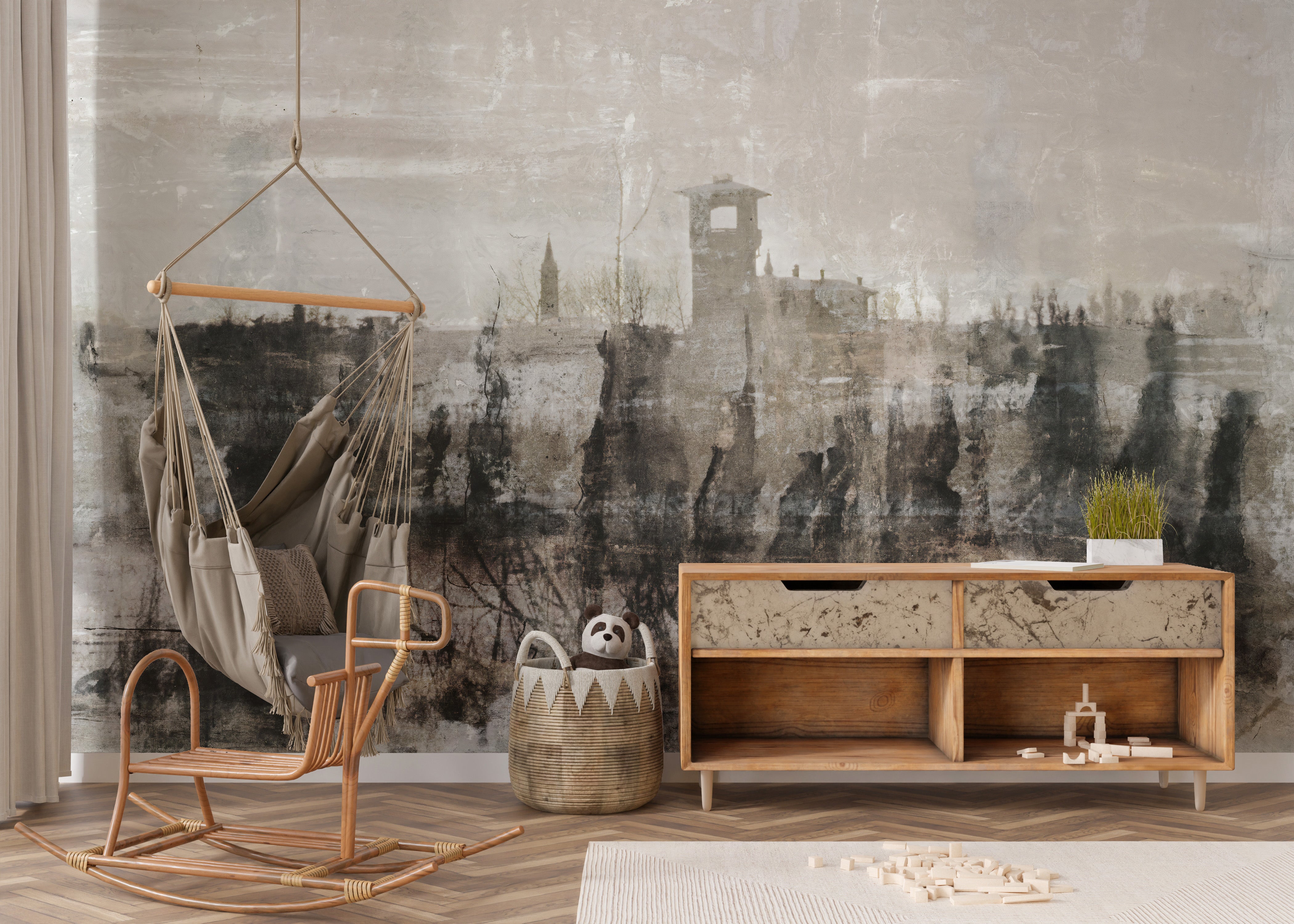 Bold inked ruins mural for modern spaces