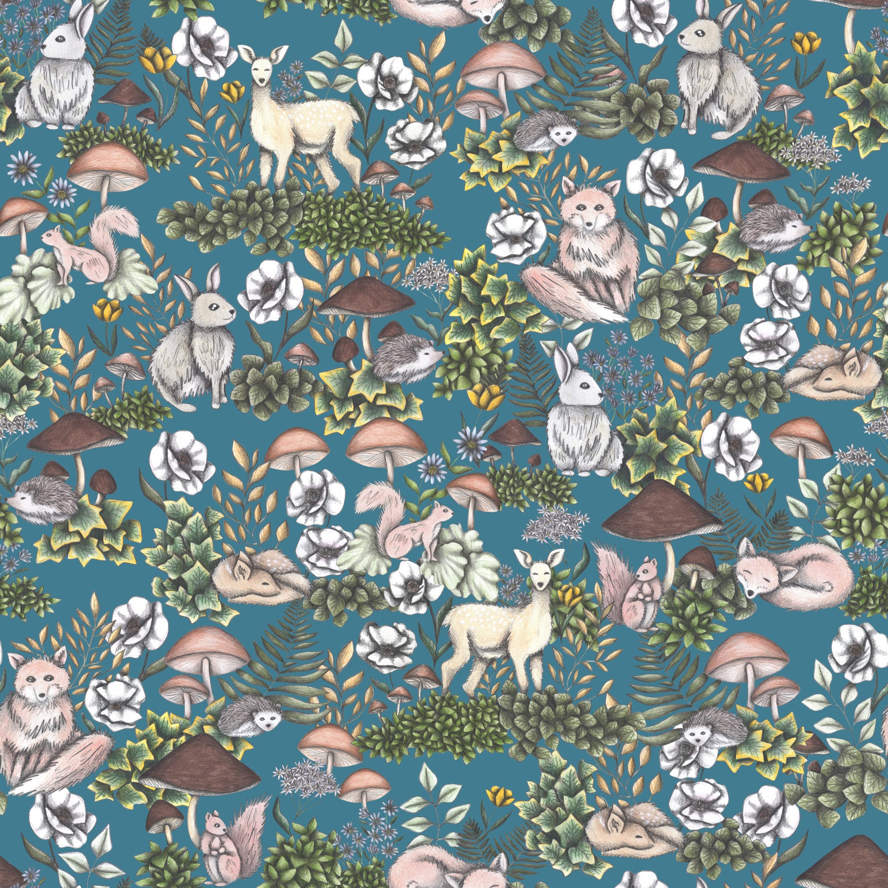 The Into the Woods Wallpaper features a whimsical mix of forest animals, soft florals, leafy foliage, and mushrooms on a rich teal backdrop. Rabbits, deer, foxes, owls, and squirrels are delicately illustrated in muted tones, creating a playful yet calm woodland scene. This mural wallpaper is perfect for nurseries, kids' rooms, or cozy corners that embrace charm and storytelling. Designed as wallpaper for walls, it pairs well with wooden accents, earthy tones, and nature-inspired decor. A delightful choice for anyone drawn to forest themes, this wall mural offers warmth, detail, and an imaginative escape into the wild.