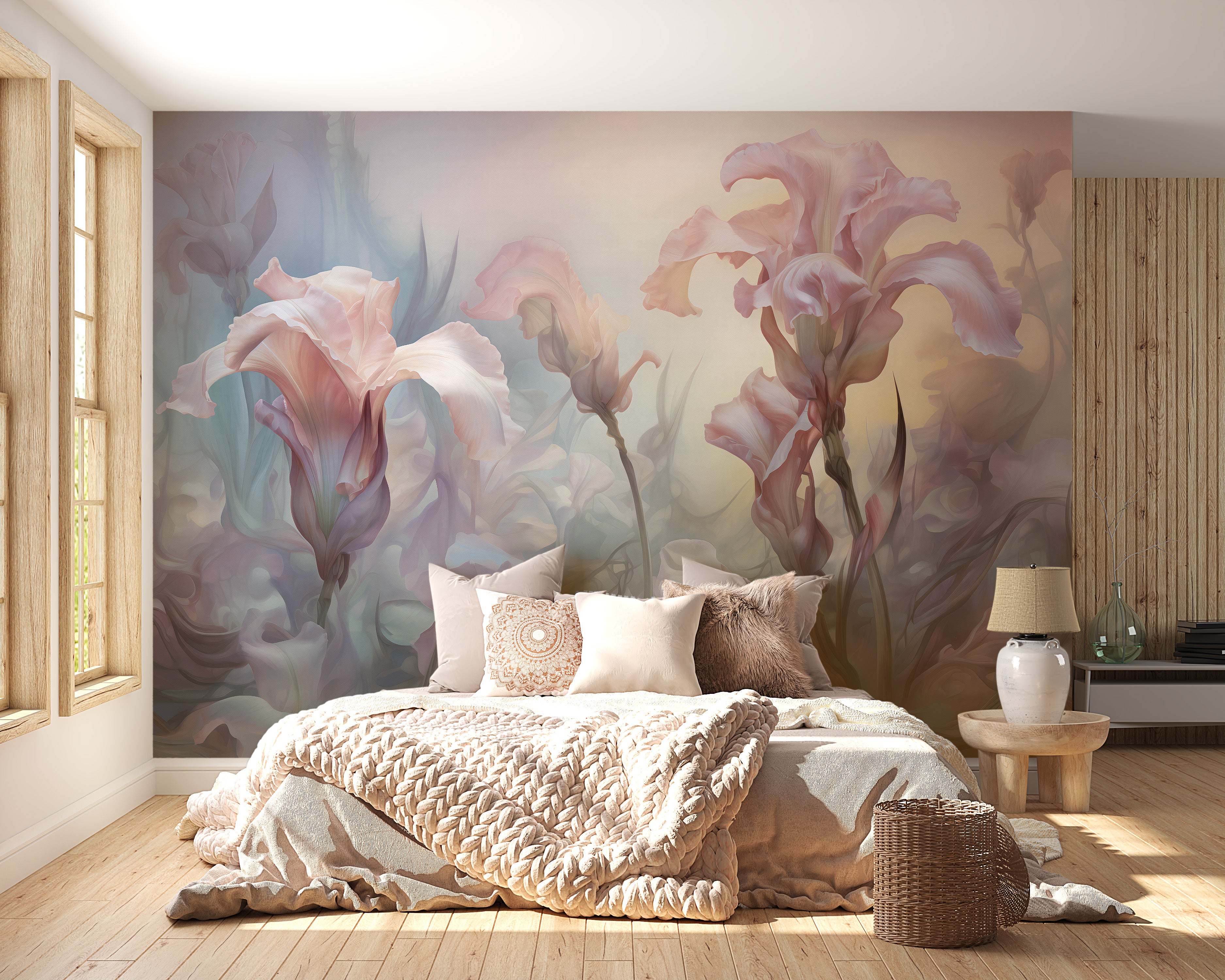 Transform your space with delicate iris pale pastel floral wallpaper mural.