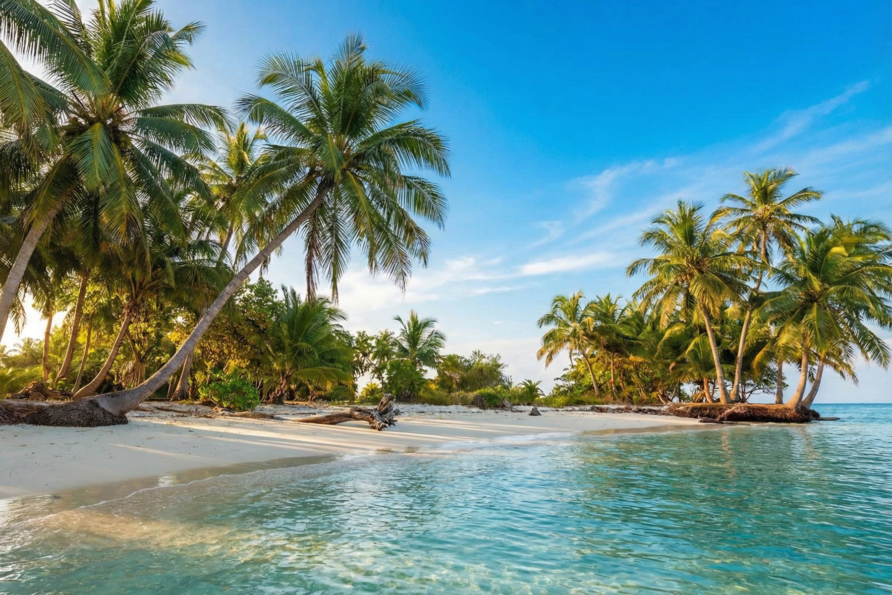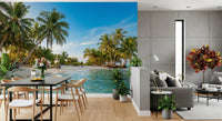 Escape to an idyllic island with this breathtaking wallpaper for walls. The design showcases lush palm trees lining a white sandy beach, kissed by gentle turquoise waters. The clear blue sky offers a sense of spaciousness and calm. This wallpaper evokes relaxation and tranquillity, making it perfect for bedrooms, bathrooms, or any space where you want to create a peaceful retreat. The vibrant colours and detailed imagery will enrich your walls, offering a scenic view that transforms any room into a personal sanctuary.