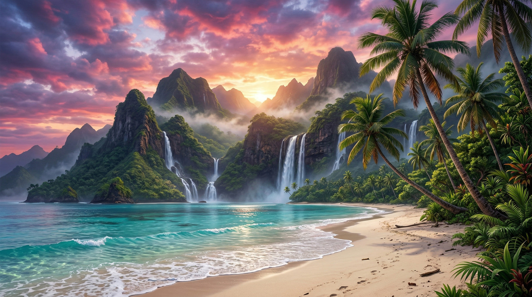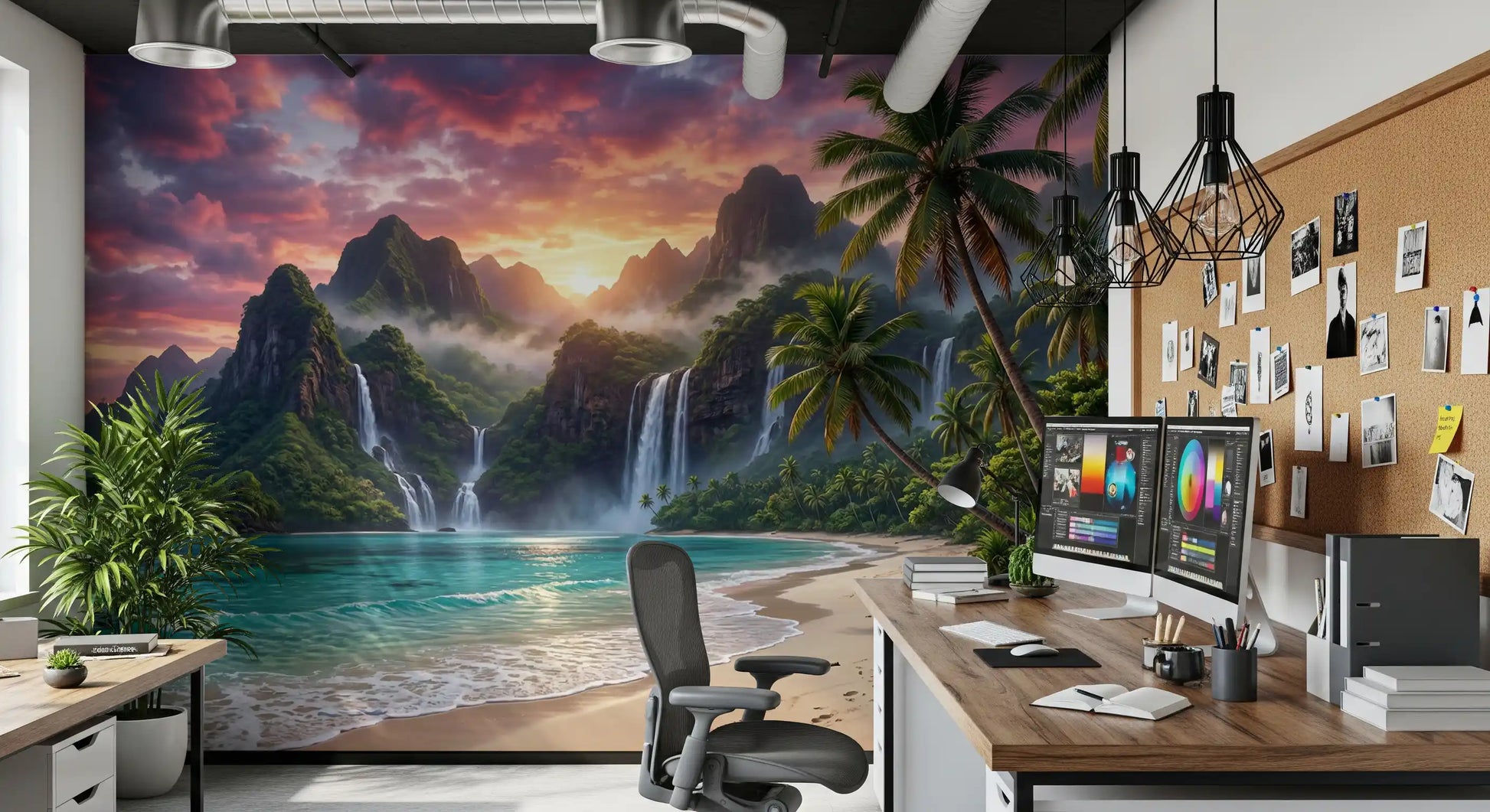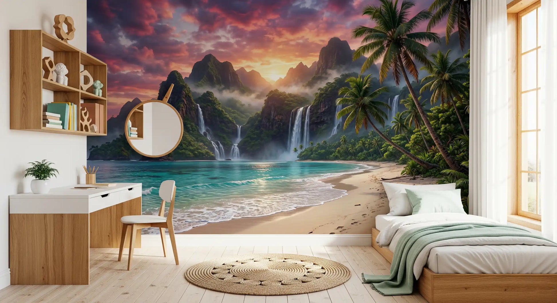 Bring the tranquillity of a remote island to your home with this captivating wallpaper for walls. Towering mountains meet pristine beaches, while waterfalls cascade through lush greenery. The soft colour palette of turquoise, green, and peach brings a refreshing touch to any room. This design looks stunning in an office, fostering a peaceful work environment, or a bedroom, creating a relaxing sanctuary. Let this scenic view transport you to a tranquil escape, enriching your interior with natural beauty and serenity.
