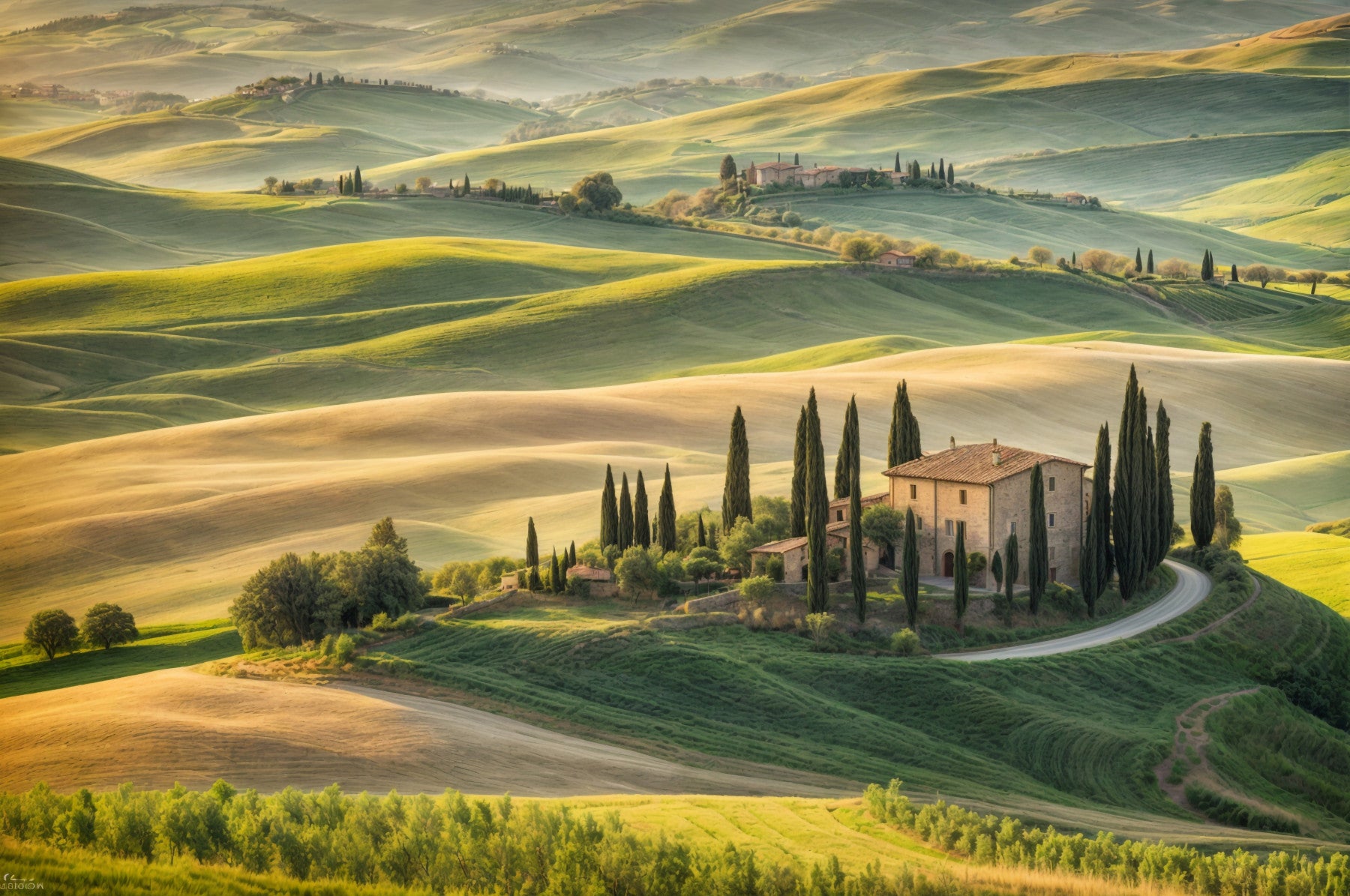 Escape to the idyllic Italian countryside with this dreamy wallpaper. The image transports you to a world of gently rolling hills, vibrant green fields, and a charming farmhouse nestled amidst a picturesque landscape. Tall cypress trees punctuate the scene, adding depth and character to the composition. Soft, warm light bathes the scene, casting a golden glow over the land, and creating an atmosphere of tranquility and peace. Perfect for bringing a touch of Italian charm and serenity to any digital device.