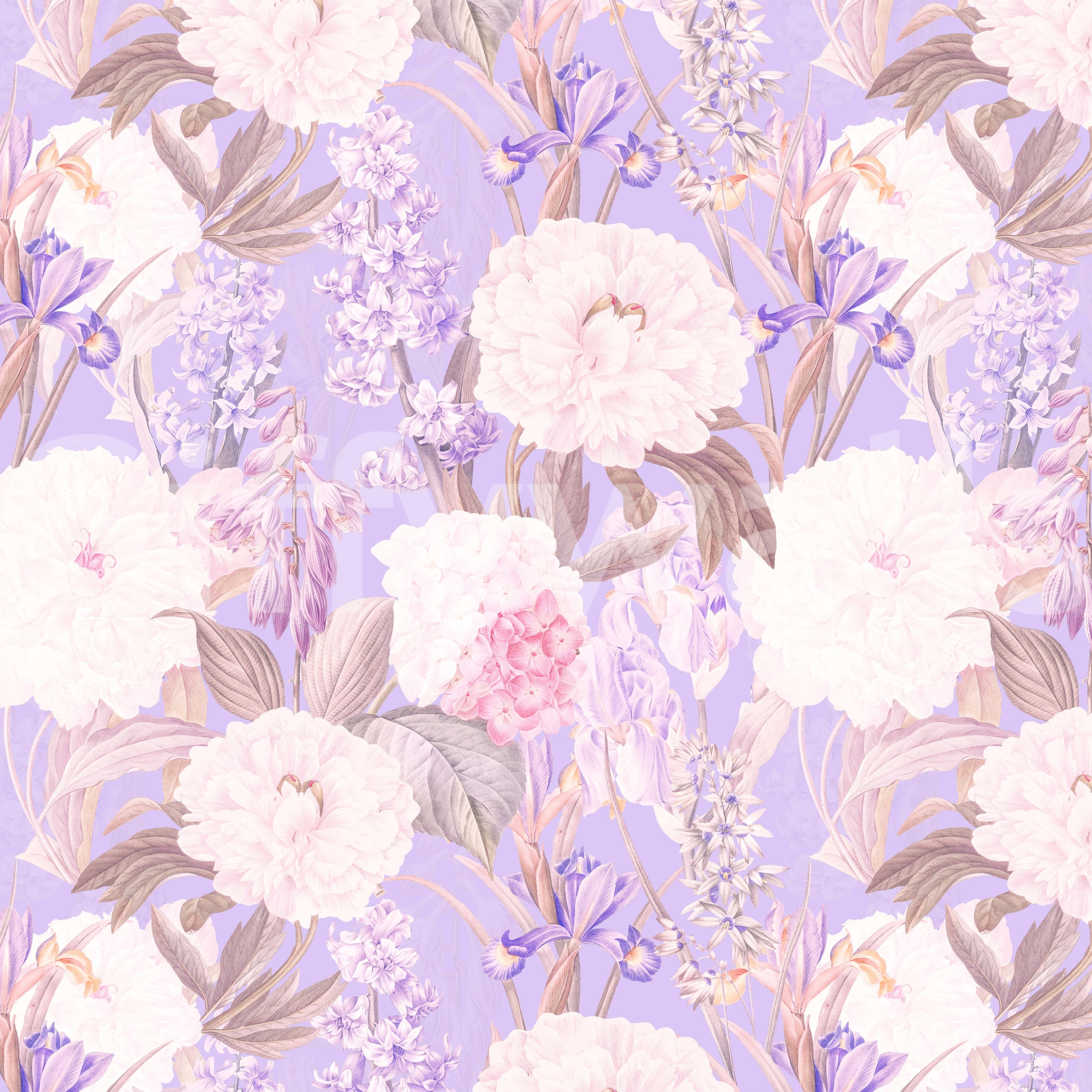Indulge in the serene beauty of Ixia Paeonia, a digital wallpaper showcasing a breathtaking array of pastel-hued blooms. Delicate peonies take center stage, their soft petals unfolding against a calming lavender backdrop. Interspersed amongst the peonies are vibrant purple irises, gentle hyacinths, and blushing hydrangeas, creating a harmonious symphony of textures and colors. The meticulous detail and painterly style evoke a sense of classic elegance and timeless charm, transforming any digital screen into a tranquil floral sanctuary. This wallpaper offers a sophisticated yet approachable aesthetic, perfect for those seeking a peaceful and visually captivating desktop or mobile background.